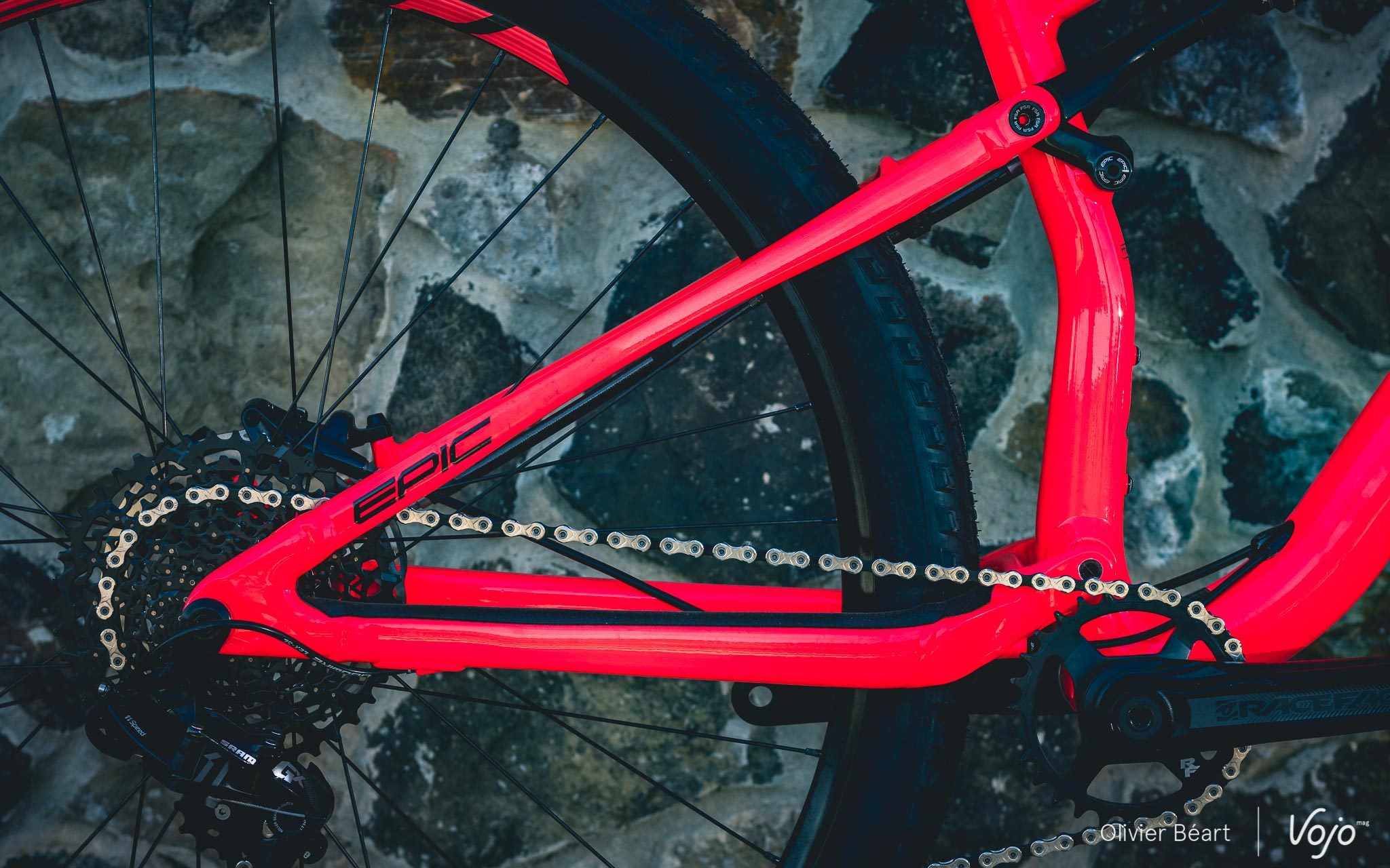 Malgré le changement de géométrie, Specialized a souhaité conserver les mêmes emplacements pour les points d’appui ainsi que pour les axes de roues. Ainsi, le nouvel Epic utilise une fourche RockShox SID avec un déport spécifique de 42mm ; une valeur qu’on retrouvait habituellement sur des vélos équipés de roues de plus petit diamètre et de plus de débattement. Cela permet de ménager la chèvre et le chou et procurant à l’Epic de la stabilité grâce à l’angle de direction plus couché, tout en préservant la vivacité et la maniabilité, notamment en montée dans les virages serrés.