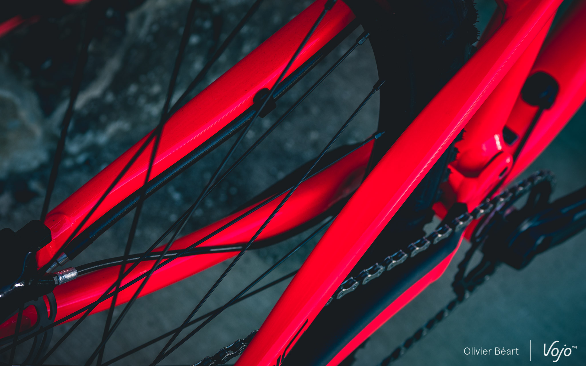 Malgré une raideur légèrement supérieure qui incitera à gonfler l’amortisseur avec quelques PSI de moins, les haubans très aplatis de l’Epic aluminium permettent d’assurer une déformation suffisante pour se passer de point de pivot.