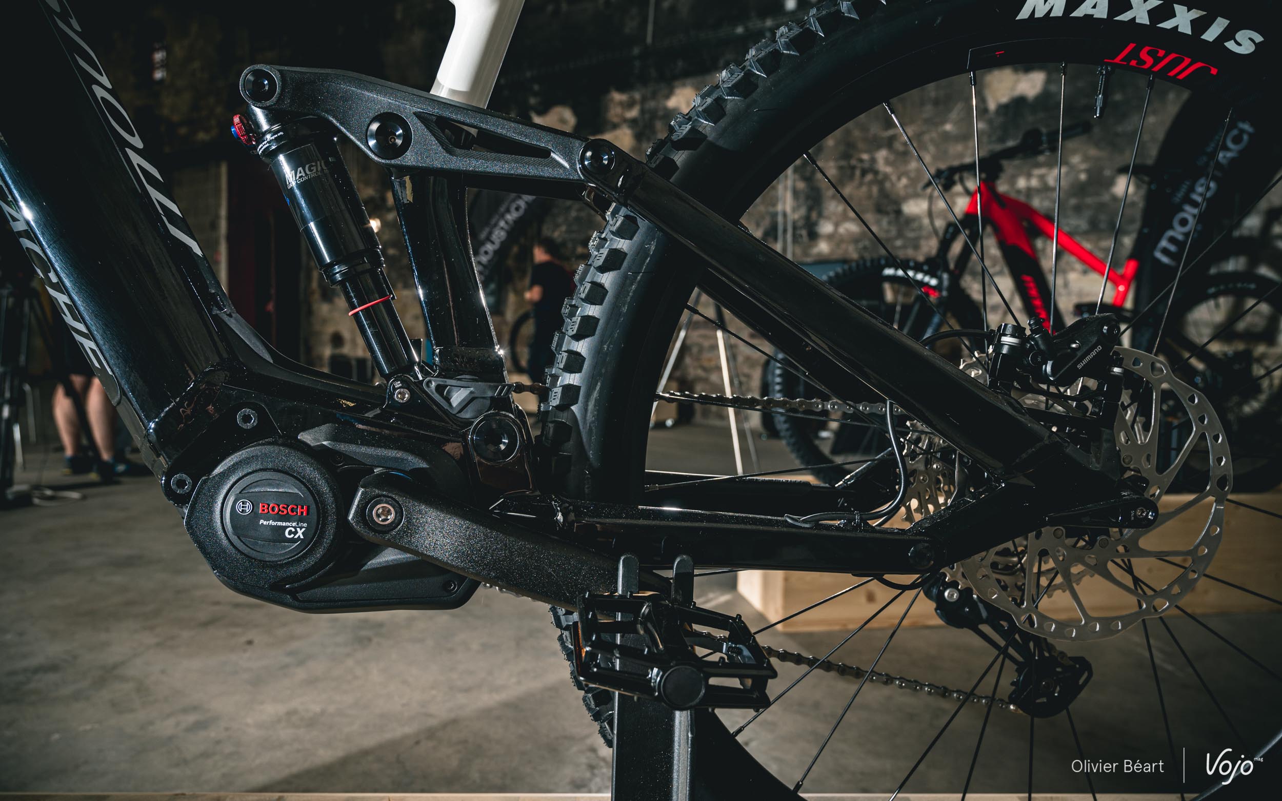 Très à cheval sur les réglages de suspensions, les équipes de développement de Moustache ont aussi revu le setting de leur amortisseur maison pour s’accorder parfaitement au changement de format de roues et de plateforme pour la fourche. Vu la présence de grandes roues, le « flip chip » situé au niveau de l’ancrage inférieur de l’amortisseur est désormais placé en position basse. On note aussi l’apparition d’une nouvelle biellette évidée et affinée, plus esthétique et légère que la précédente.