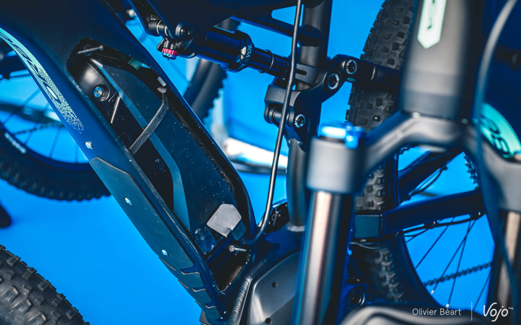 La suspension arrière Advanced Dynamics rappelle celle d’un Orbea Occam et c’est vrai qu’elle en est largement inspirée, mais le débattement est de 140mm (à l’avant comme à l’arrière), les points de pivot sont renforcés et l’amortisseur ainsi que la fourche sont spécifiques ebike (courbe de compression custom et châssis renforcé pour la fourche).