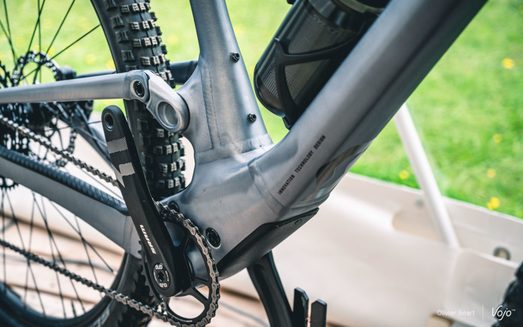 A propos de compacité, difficile aussi de faire plus ramassé que la biellette. En aluminium, elle est au cœur du système, puisque c’est elle qui assure la connexion entre l’extérieur et l’intérieur du cadre. Elle est constituée de trois pièces qui s’emboîtent via un système de cannelures. Un ensemble qui offre une rigidité nettement meilleure que toutes les biellettes classiques qu’on connaissait jusqu’ici. Le tout est monté sur roulements surdimensionnés avec en plus un joint d’étanchéité supplémentaire. Cela a aussi permis de se passer de pontet de renfort entre les haubans, ce qui laisse plus de dégagement au pneu.