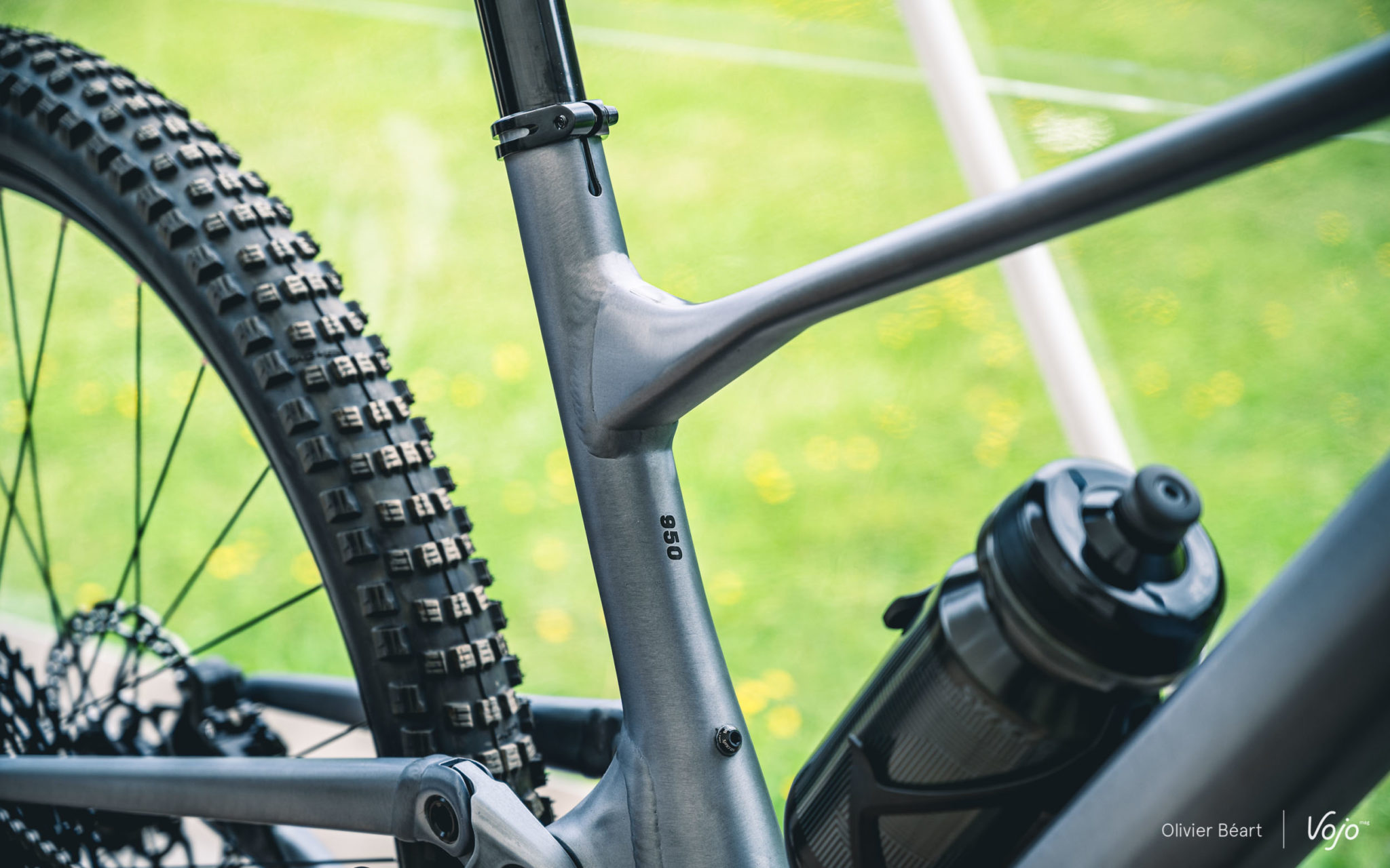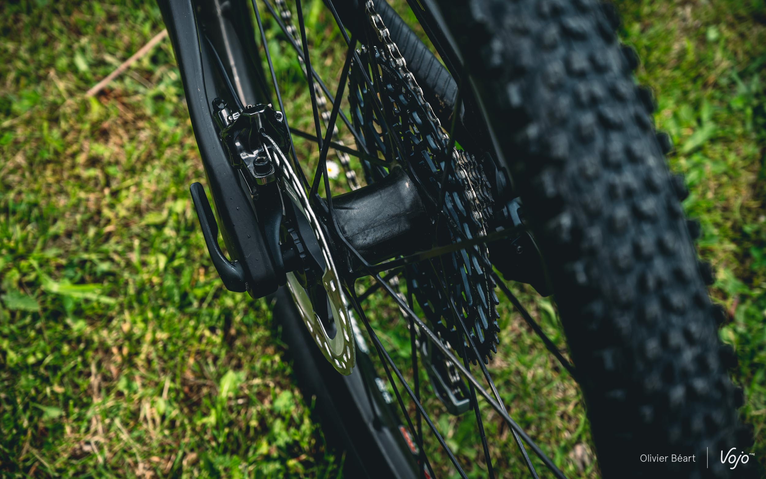 Tant qu’on en est à parler de l’arrière du vélo et du triangle arrière très compact, parlons aussi du dégagement du pneu. On le sait, depuis quelques années, les pilotes de coupe du monde utilisent des pneus de plus en plus large qui leur permettent d’obtenir un meilleur grip et plus de vitesse sur les parcours de niveau mondial devenus très techniques. S’ils gardent des dessins et des carcasses très typées XC/rendement, le ballon de ces pneus est très proche de celui de modèles d’enduro. Il faut donc de l’espace au niveau du cadre pour les accueillir.