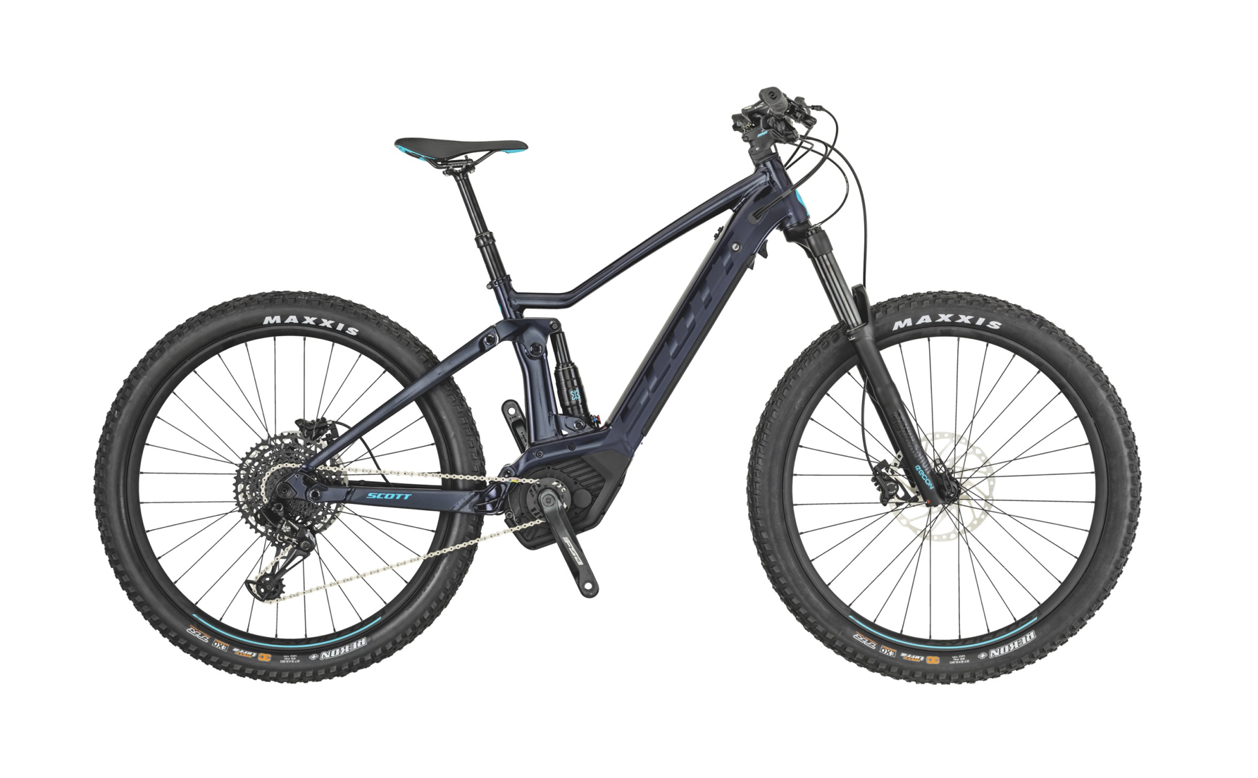 Le cœur de la géométrie et de la cinématique Scott a été décliné, conservant le Four Bar Linkage et la fixation Trunnion pour l’amortisseur, ici un Fox Float, couplé à l’avant avec la Fox 34 Rhythm spécifique ebike, tous deux en 140 mm.