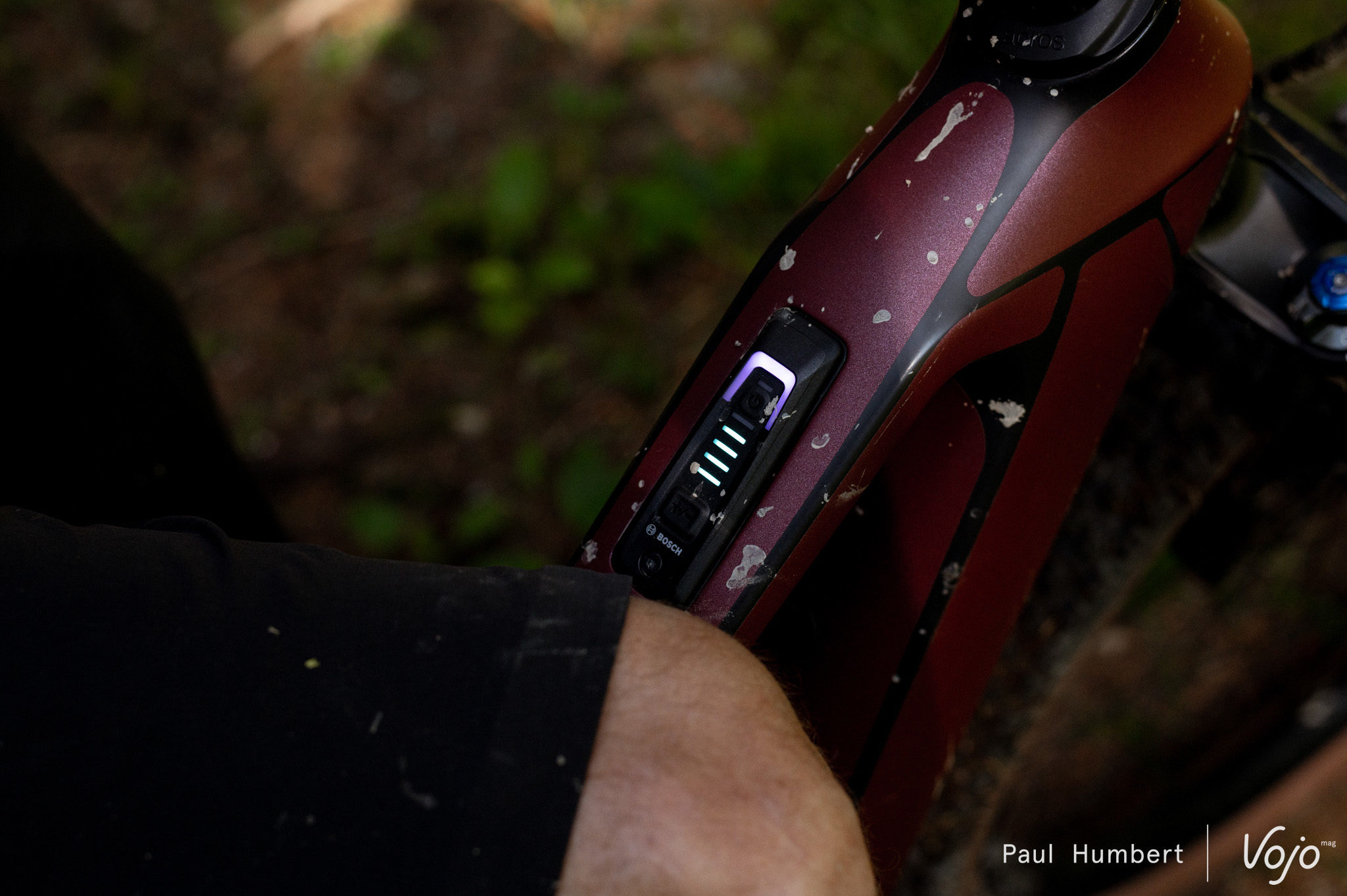 Sur le terrain, on retrouve un moteur qui offre une assistance proportionnelle au vélo et à son poids. Le mode éco est très léger, mais dès les modes Tour et EMTB, on retrouve la puissance et la précision qu’on connaît chez Bosch, il faut simplement donner un peu plus pour aller les chercher. En pic, le moteur est effectivement un peu moins puissant mais il reste coupleux et on a simplement perdu les moments où le vélo va nous « embarquer » dans une portion technique, et ce n’est peut-être pas plus mal. Les reprises après un arrêt du pédalage sont maîtrisées, toujours musclées, mais un peu plus progressives et il n’y a pas de « trou » dans l’assistance. En mode « EMTB », on retrouve « l’extended boost » qui prolonge la poussée quelques dixièmes de secondes, ce qui est fort agréable pour passer les obstacles.