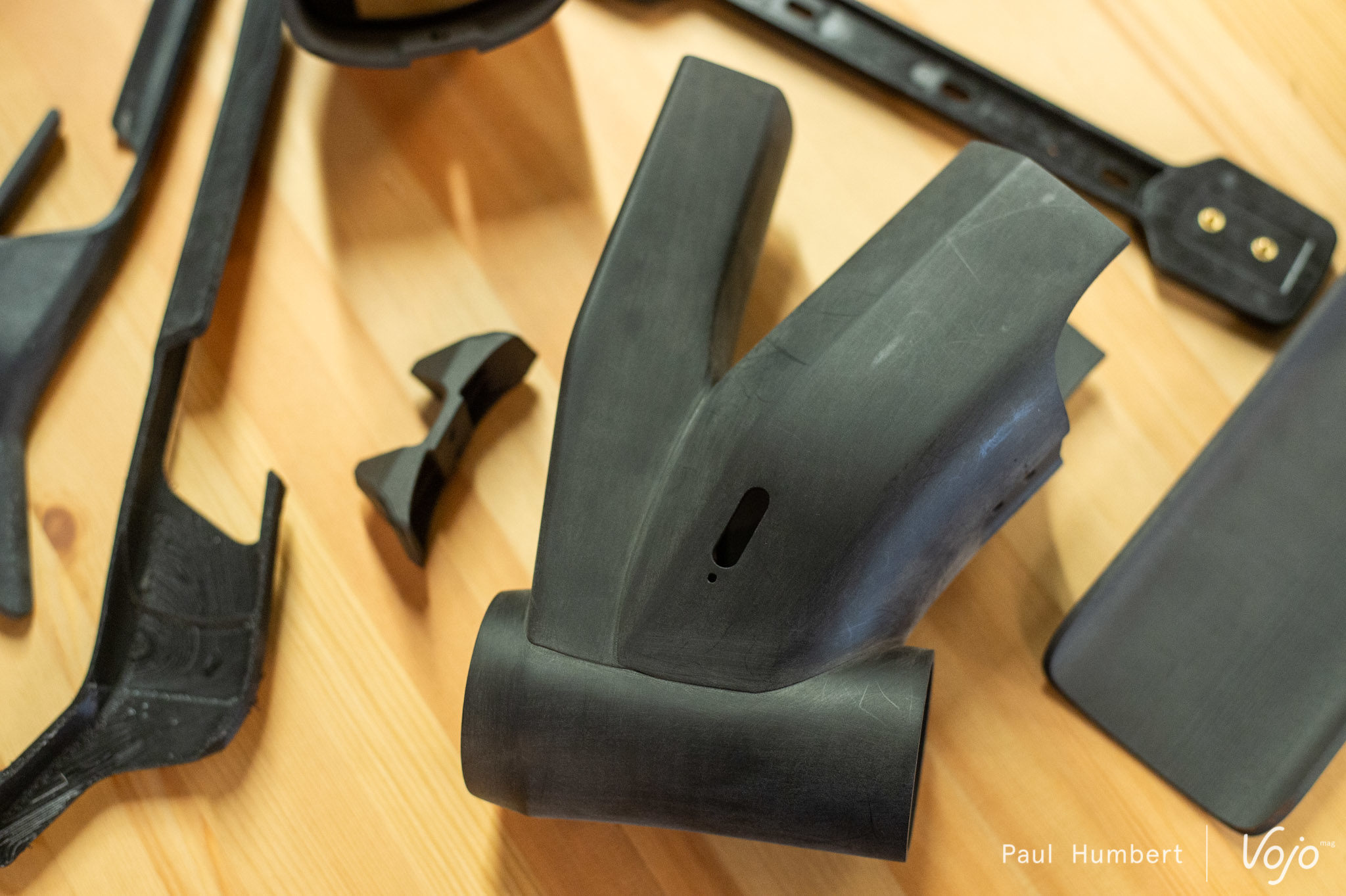 On découvre d’abord les impressions des cadres en 3D qui ont permis le développement des machines (nous y reviendrons dans un second article), la prise de chargement qui se positionne sur le top tube, les passages en interne ou encore les « bumpers » qui viennent protéger les cadres de la rotation de la fourche.