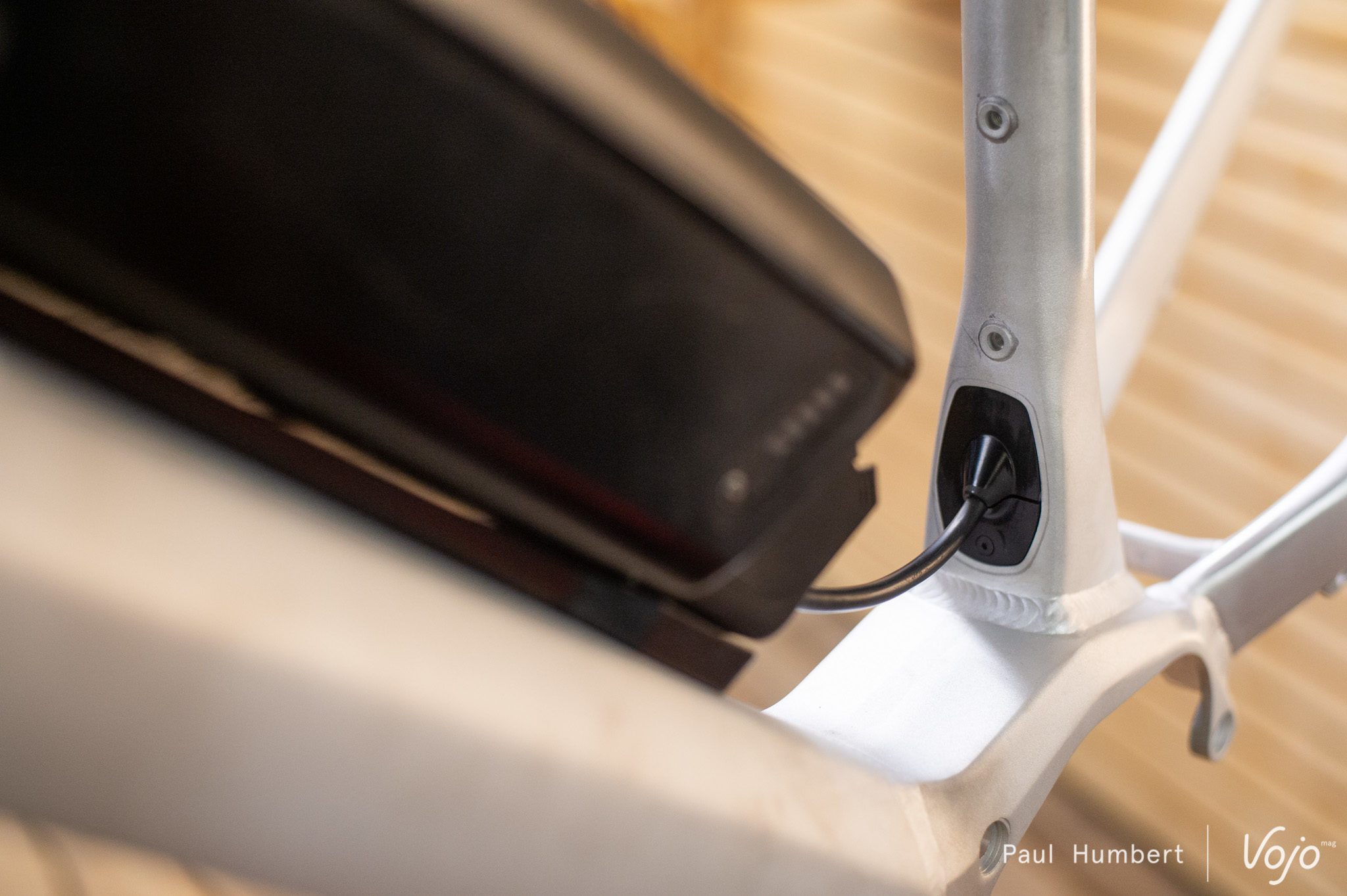 À l’intérieur du tube inférieur, les câbles sont maintenus en place par des guides, juste derrière la batterie.