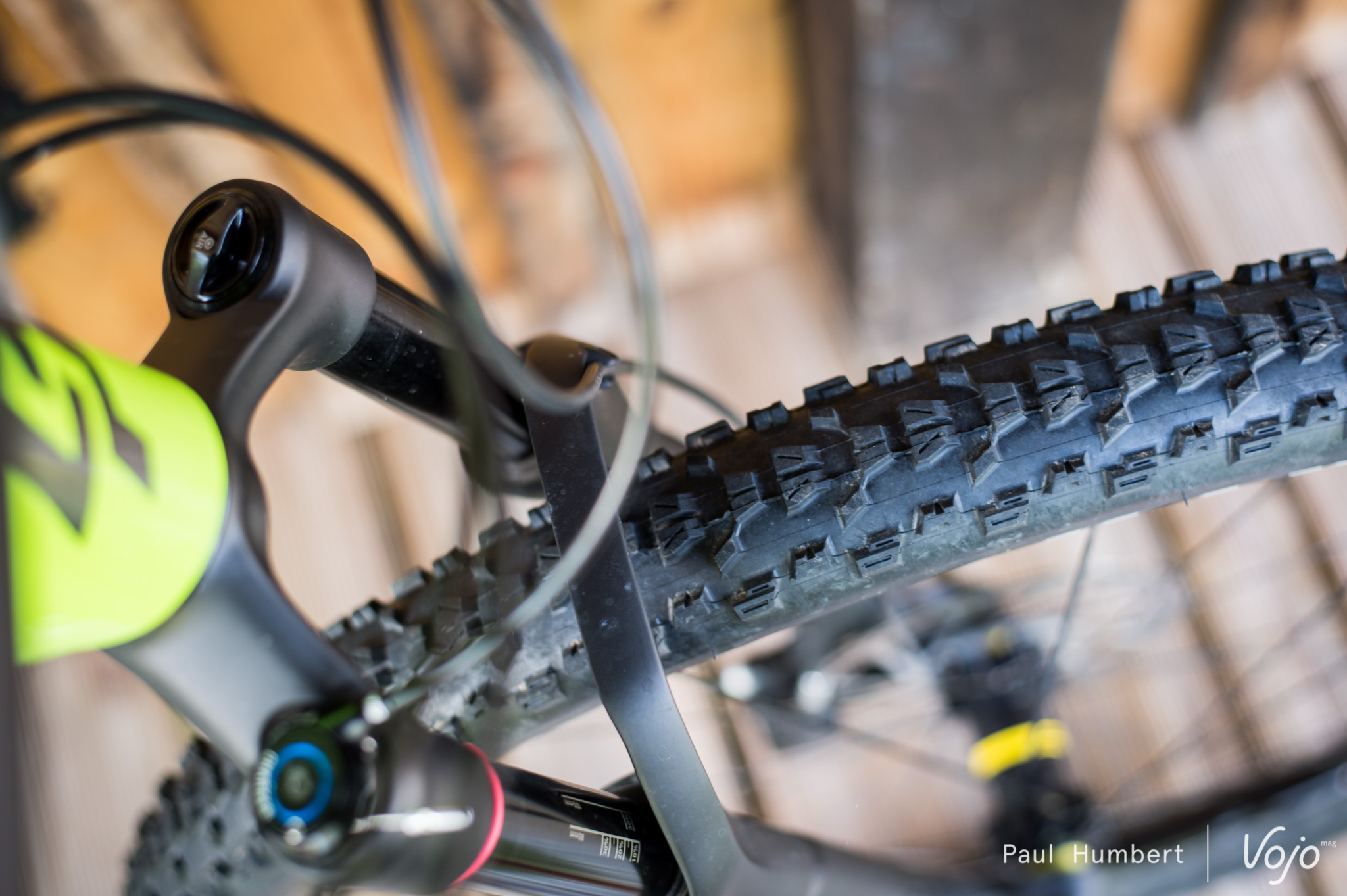 Le vélo est équipé de roues de 29 pouces et les pneus ne devront pas excéder 75mm de largeur, soit environ une section 2.4, pour passer dans le cadre.