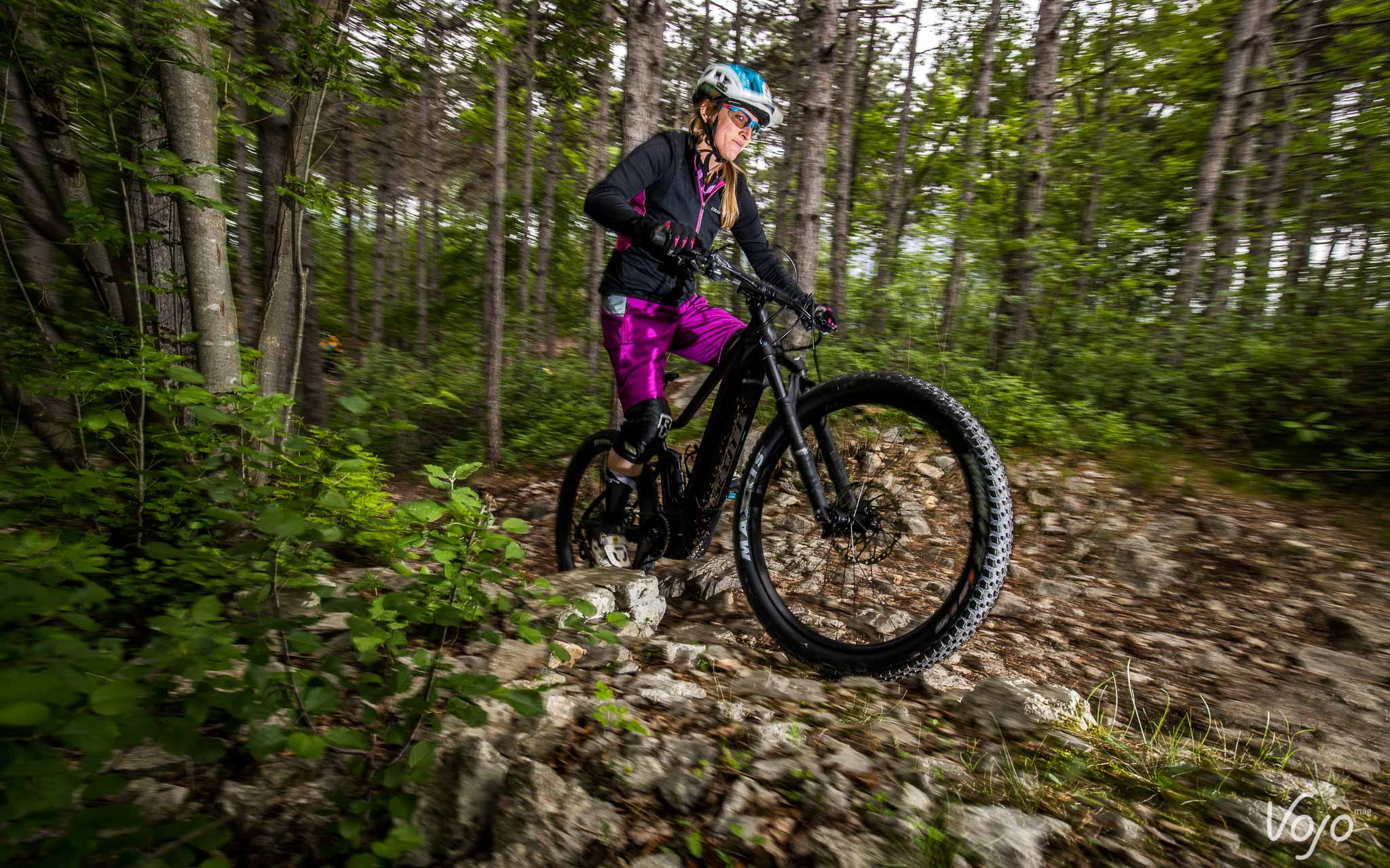Et à voir les sourires radieux de la petite troupe au bas de la piste, le cocktail était bon ! Seules les multiples crevaisons (chez la quasi-totalité des rouleurs français, votre serviteure exceptée – d’ailleurs) ont ralenti l’allure. À l’arrière, dans les tracés engagés ponctués de pierres saillantes, le Maxxis Rekon+ a souffert malgré sa carcasse Evo. Ce fut bien là la seule souffrance de cette sortie. 63 kg pour la pilote au guidon, 22 km de roulage avec 70% d’utilisation en mode Boost n’ont croqué qu’une des 5 bûchettes de la batterie.