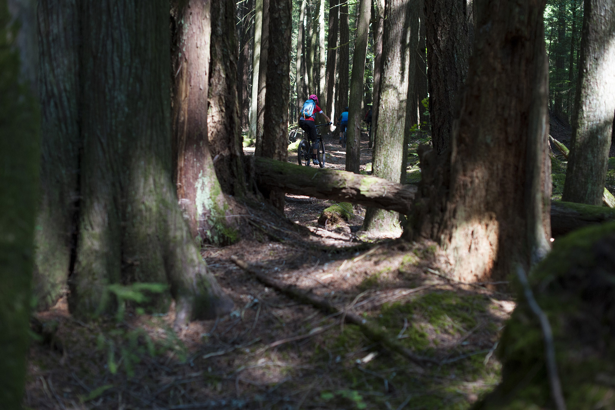 Place enfin à la découverte des véritables trails de Squamish ! Et ça commence fort, par la longue montée en forêt de Fifty Shades of green. L’étagement de la transmission fait merveille, ce ne sont pas les pignons qui manquent, mais plutôt les jambes sous cette chaleur écrasante, qui réclameraient presque une section de pneus un brin plus fine.