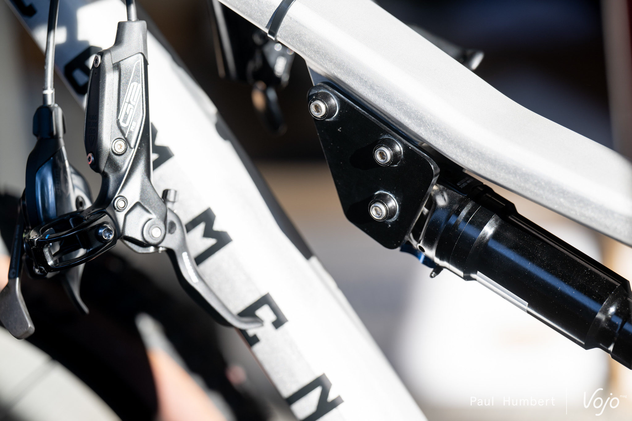 En effet, on remarque que la fixation de l’amortisseur est très peu raffinée et vissée plutôt que soudée, l’idéal pour essayer différentes positions. A l’avant, on repère aussi un jeu de direction réglable, qui permet probablement d’essayer différents angles de direction ou différents reach.
