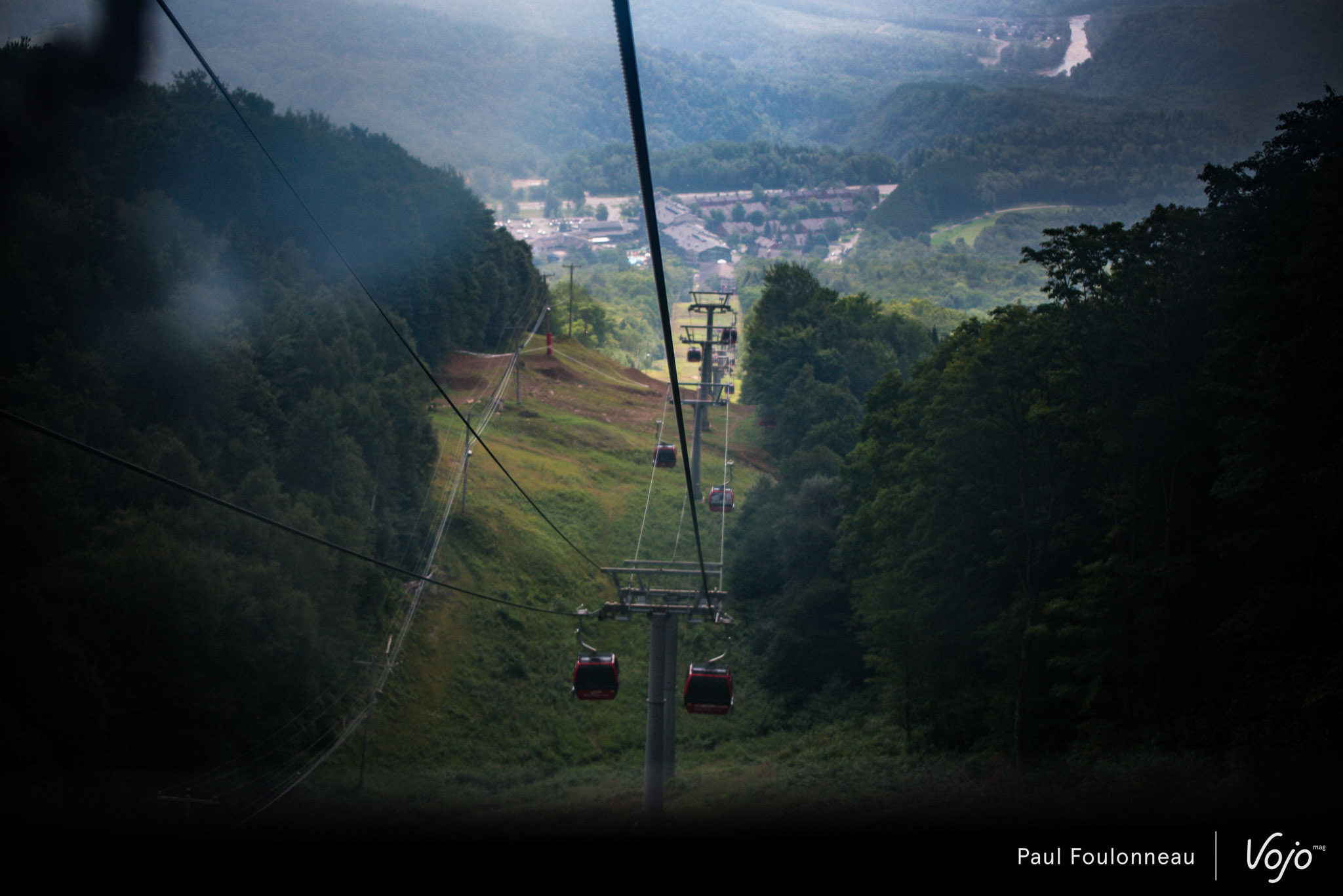 Shannahan est située à une heure et demie de Québec, au nord-ouest. C’est l’un des spots emblématiques de la région. Programmée au sixième jour de notre aventure, cette étape a un certain goût de récompense, un peu comme un dessert frais. Le départ est donné sur une grande piste que nous roulons le temps de nous échauffer. Mon départ est prudent. Le profil de l’étape est descendant et ne comporte qu’une véritable bosse, au kilomètre vingt-sept, où une montée de quatre kilomètre fera office de montée chronométrée avant de basculer directement dans la descente chrono de deux kilomètres.