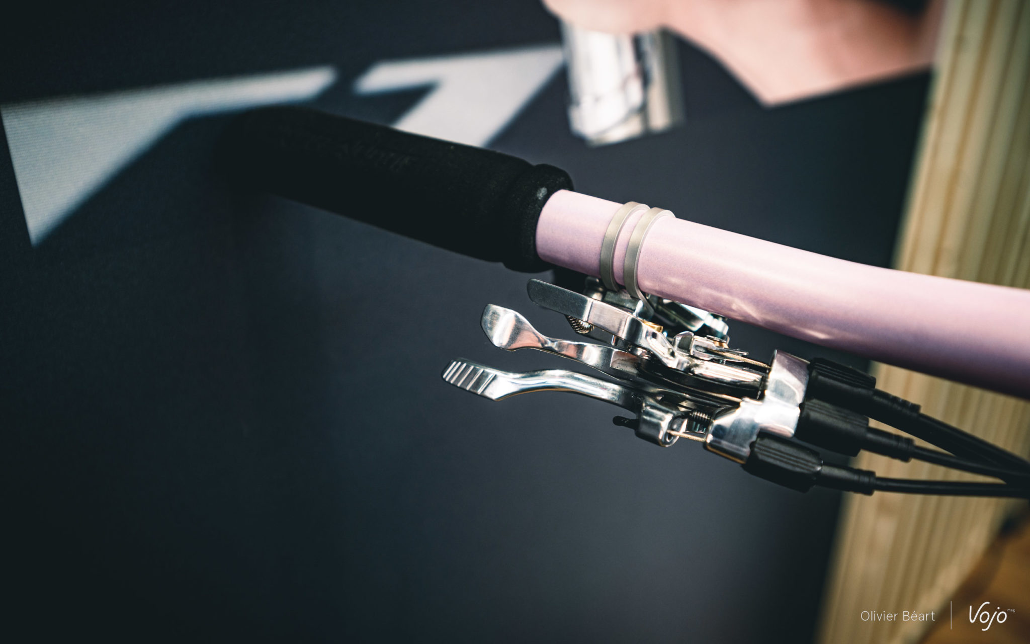 « Au niveau de la transmission, j’ai une paire de manivelles Garbaruk prototype en alu. Et je suis resté sur une transmission mécanique. J’aime beaucoup le fonctionnement du Sram AXS, que j’aime combiner avec les commandes Zirbel très discrètes, mais le dérailleur AXS est très massif, plus difficile à alléger, et j’aime aussi toujours le côté plus épuré du mécanique au niveau du dérailleur. Qui a aussi été modifié avec des pièces carbone et une cage alu custom. Au final, j’arrive à 9,19kg ! »