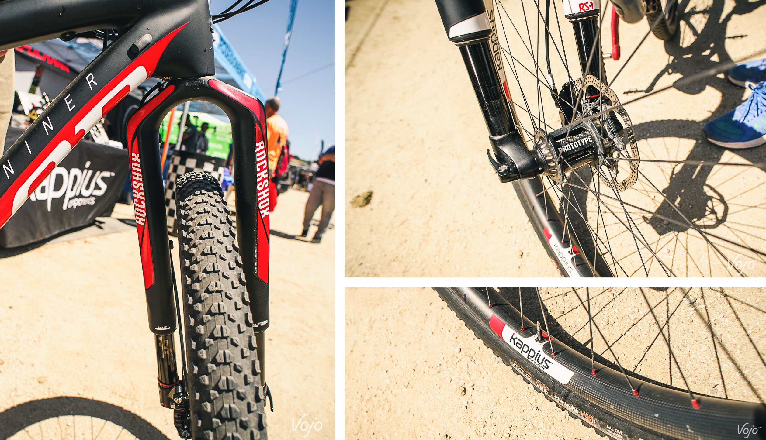 Un pneu Maxxis Ikon en 2.35 monté sur ses 40mm entre crochets donne un ballon impressionnant, que l’homme décrit comme parfait pour des terrains rocailleux et sablonneux. La jante est annoncée à 435g et elle est vendue 699$. Le moyeu spécial RockShox RS-1 est un prototype unique et aucune commercialisation n’est prévue.