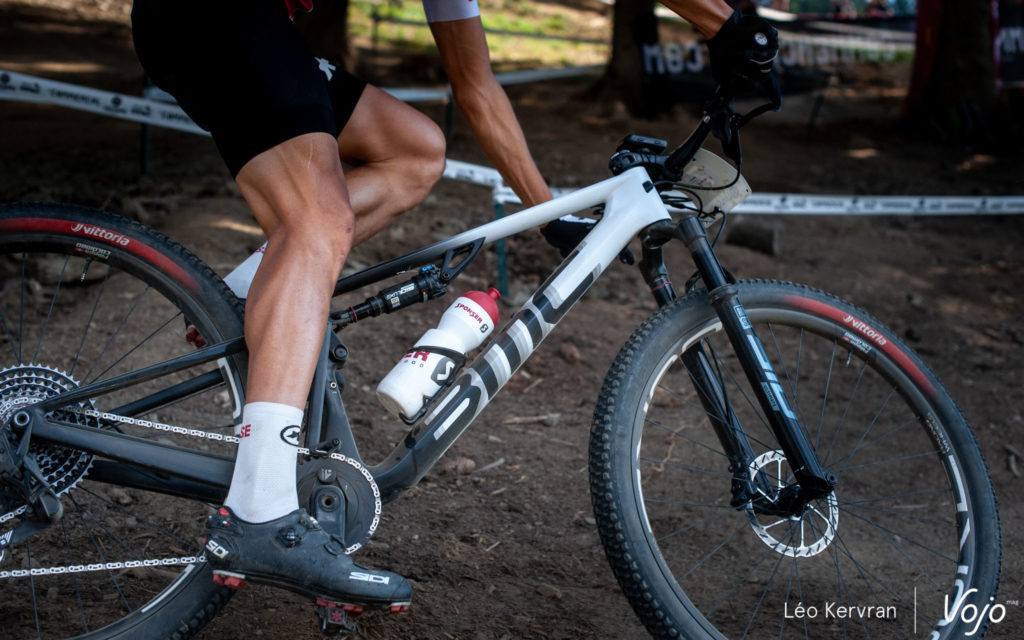 Un examen plus approfondi permet de relever que la fourche est une RockShox Sid Ultimate et non une Sid SL Ultimate. Officiellement, ce modèle n’existe qu’en 120 mm de débattement. Cela signifierait-il que l’arrière passerait lui aussi à 120 mm, comme sur le dernier Scott Spark RC ? On note aussi que le petit triangle qui relie l’amortisseur au tube supérieur semble vissé, ce qui pourrait permettre de faire varier la cinématique ou le débattement.