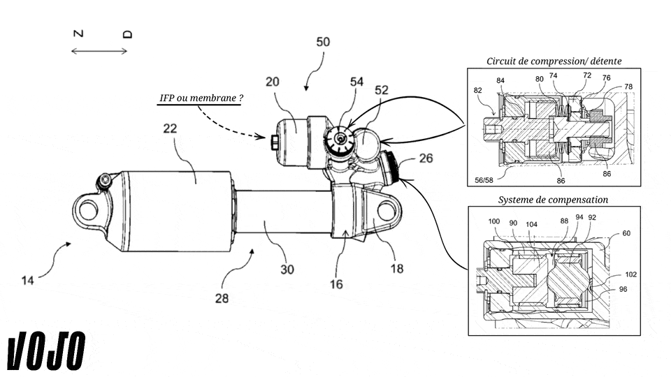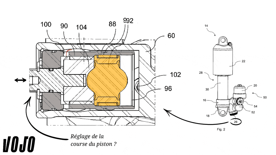 Ainsi ce piston flottant 92 permet, selon le brevet, d’ajuster automatiquement la force d’amortissement en fonction de l’amplitude du mouvement de la suspension.