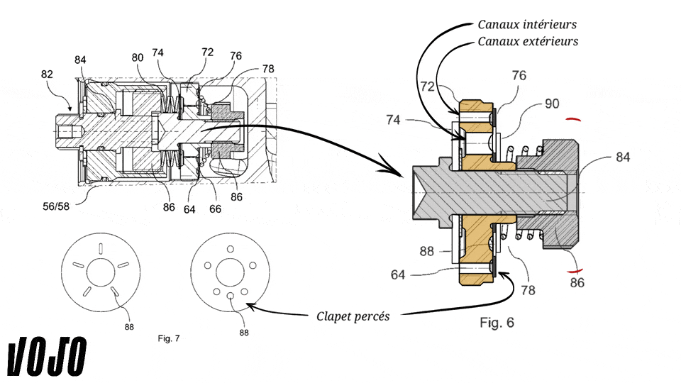 Dans le sens inverse, l’huile passe directement dans les canaux extérieurs et vient soulever les clapets 76 en comprimant le ressort 78. Dans ce sens, le fonctionnement pourrait être assimilé à une “check valve”, entendez par là que l’huile peut passer sans qu’il n’y ait de grande résistance. Le brevet précise également que la précontrainte du ressort 80 peut être ajustée grâce à un réglage de molette. Cela pourrait alors s’apparenter à un réglage de haute vitesse.