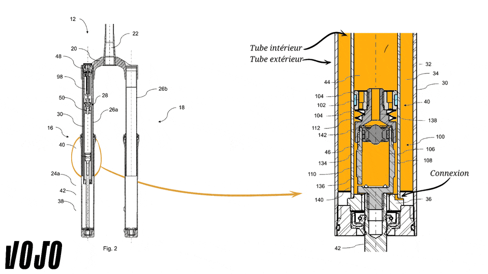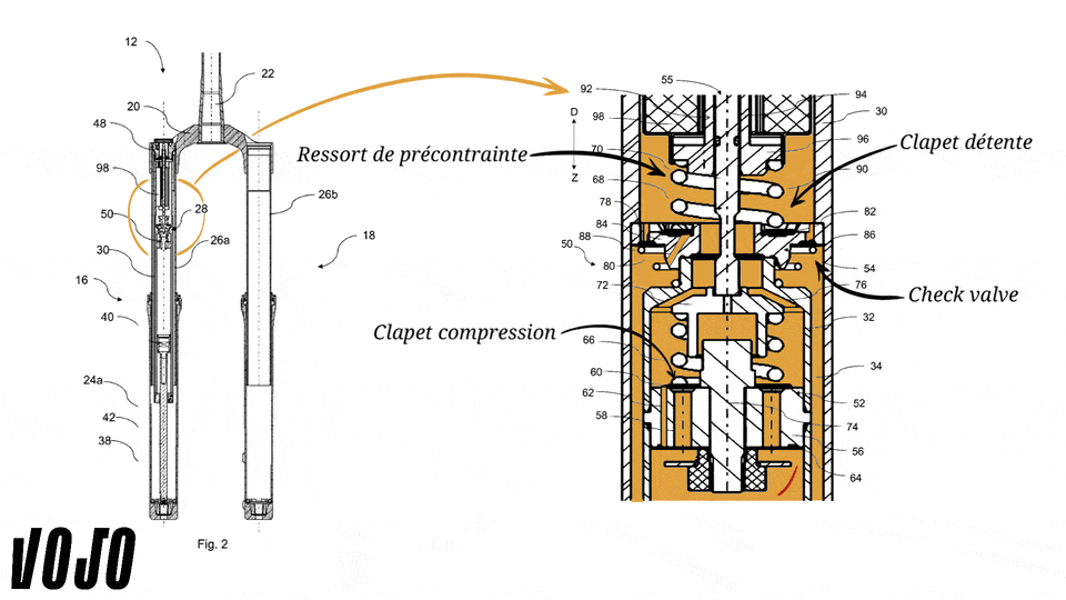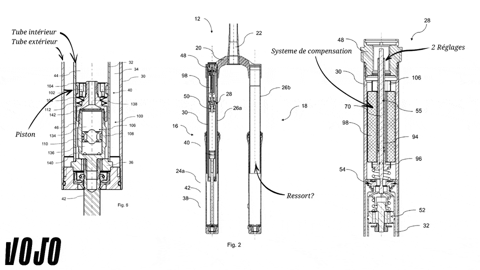 Si l’amortisseur fait l’objet de deux brevets, la fourche quant à elle est présentée dans pas moins de quatre brevets.