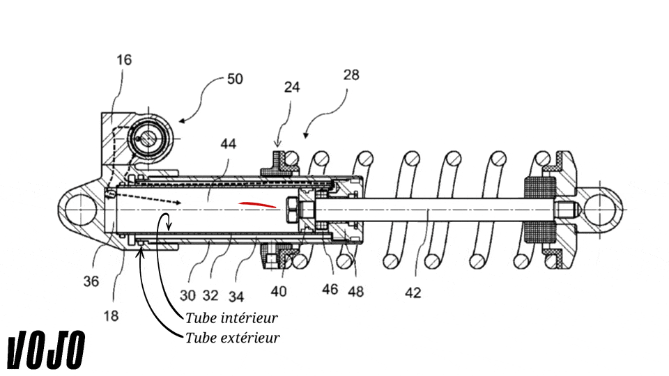 De cette manière, comme l’huile n’est pas contrainte de passer dans différents clapets et orifices, la force d’amortissement est “faible voire nulle” comme le précise le brevet. Néanmoins, lorsque l’amplitude augmente, le volume d’huile déplacé par le piston 40 permet de mettre le piston flottant 92 en butée. Ainsi, l’huile s’accumule et est dorénavant obligée de se diriger vers les assemblages de pistons et clapets 52 et 54.