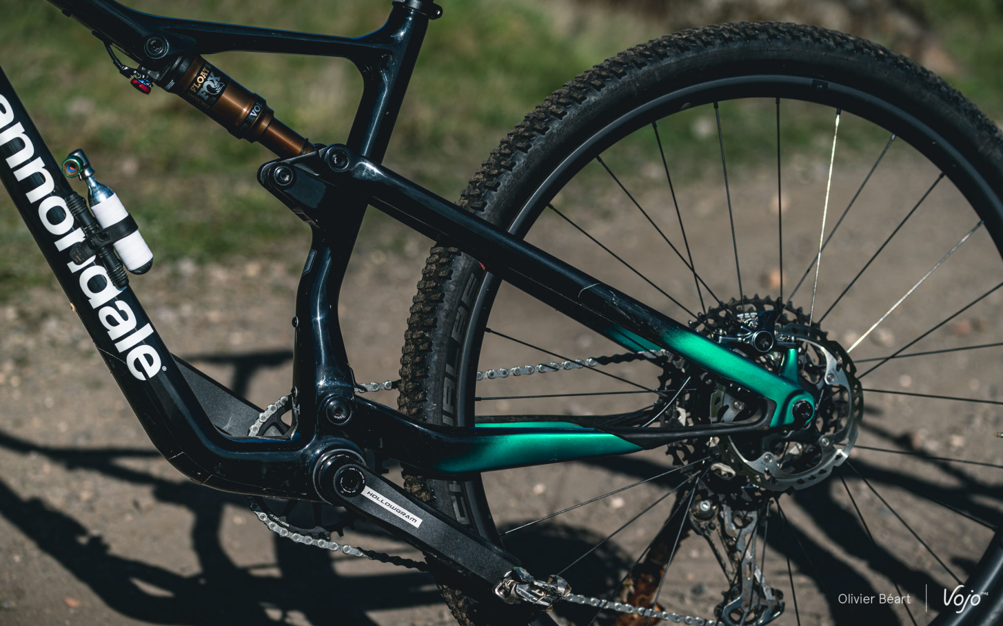 Commençons par la suspension. Cannondale dit avoir travaillé pour rendre la suspension de cette nouvelle version plus active, afin d’offrir plus de grip et aussi plus de confort pour permettre au pilote de se reposer. Et c’est vrai ! Par rapport à la précédente génération, on est toujours sur une suspension qui reste assez haut dans le débattement en toutes circonstances, qui ne s’enfonce pas pour un oui ou pour un non, mais qui se montre tout de même réellement impressionnante dans l’absorption des impacts.