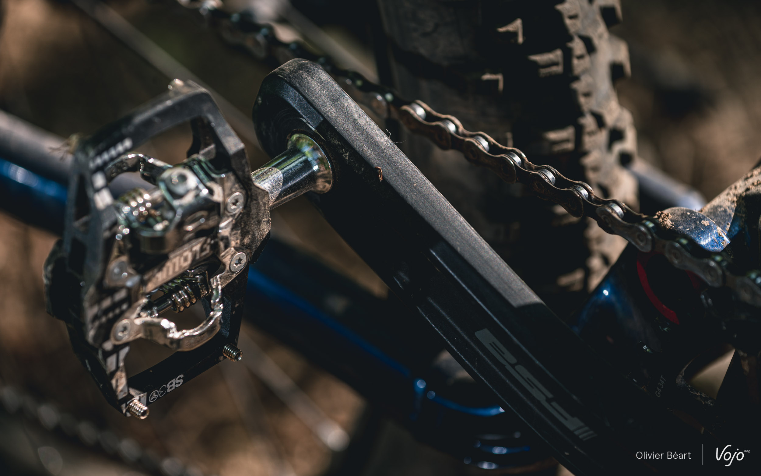 Gros bémol par contre pour les manivelles FSA qui sont « faussement courtes ». La fiche technique annonce une longueur de 165mm, ce qui est parfait pour un e-bike avec lequel on est amené à pédaler dans les parties techniques, où un pédalier à manivelles courtes va permettre d’éviter de taper le sol à chaque tour de pédale. Le souci, c’est qu’ici, c’est juste le trou de fixation des pédales qui est décalé, mais les manivelles elles-mêmes font plus de 19cm de long ! Bilan, il arrive régulièrement de toucher le sol, d’autant que le Stilus est plutôt bas du boîtier. On finit par s’y habituer mais c’est vraiment dommage car ce ne serait pas très compliqué de faire de vraies manivelles de 165mm. On peut parler ici d’économies de bouts de chandelle.