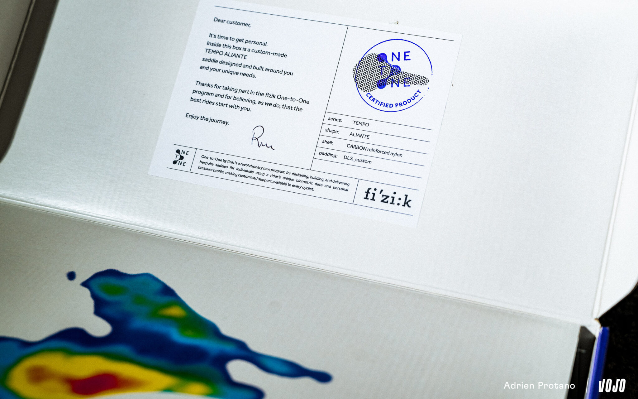 La selle reçue est une Fizik Tempo Aliante One-to-One, livrée dans un emballage soigné. Petit clin d’œil appréciable : la carte de pression issue de l’analyse est directement imprimée sur le carton de la boîte