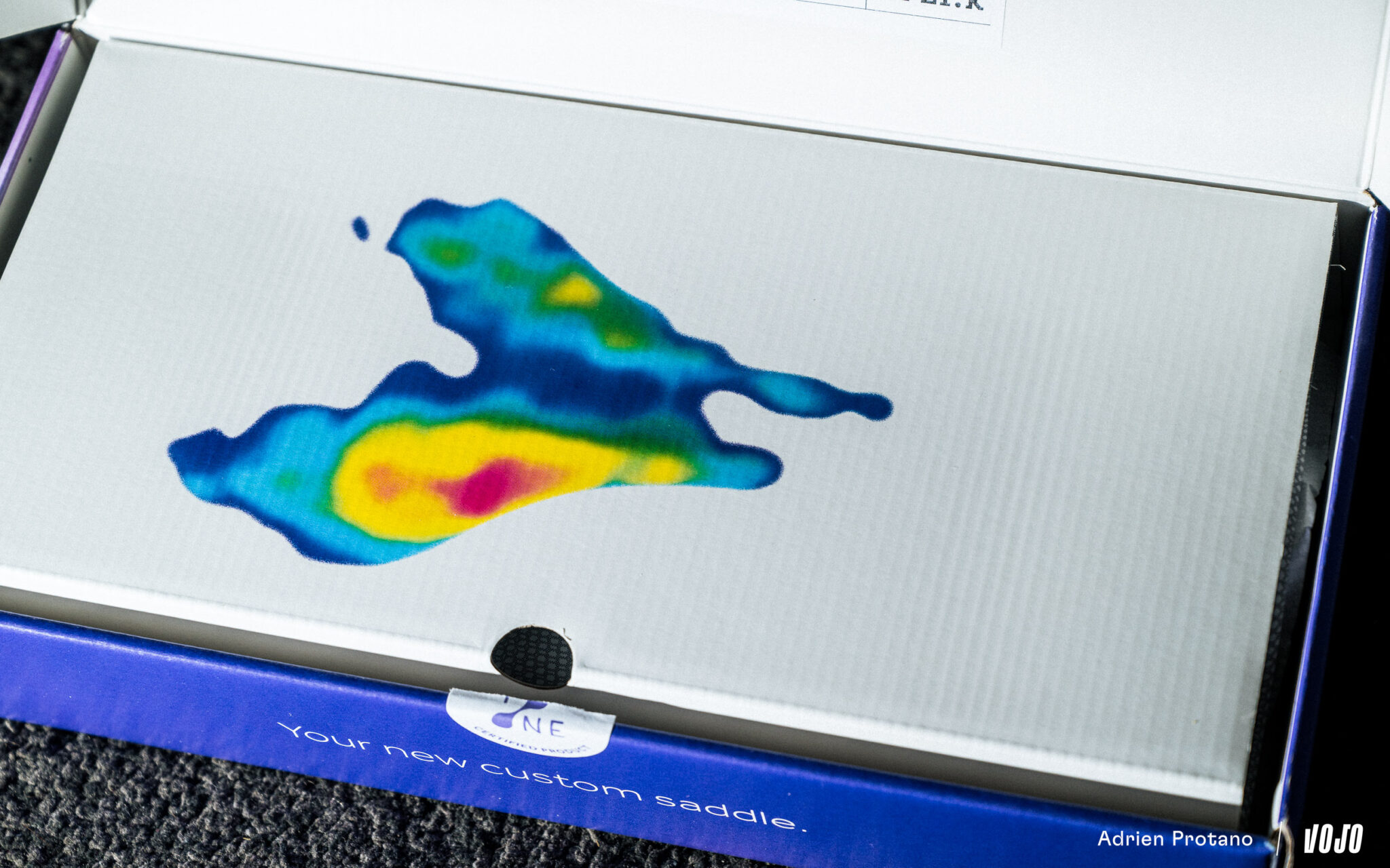 Deux semaines après la séance de mesure, la selle fait son arrivée ! C’est durant ce laps de temps que Fizik imprime la structure interne, en adaptant la densité du matériau selon les zones identifiées comme sensibles lors de l’analyse. Dans notre cas, la cartographie avait révélé un déséquilibre assez marqué, avec une pression plus importante sur la fesse droite, un détail que nous n’avions jamais réellement conscientisé auparavant.