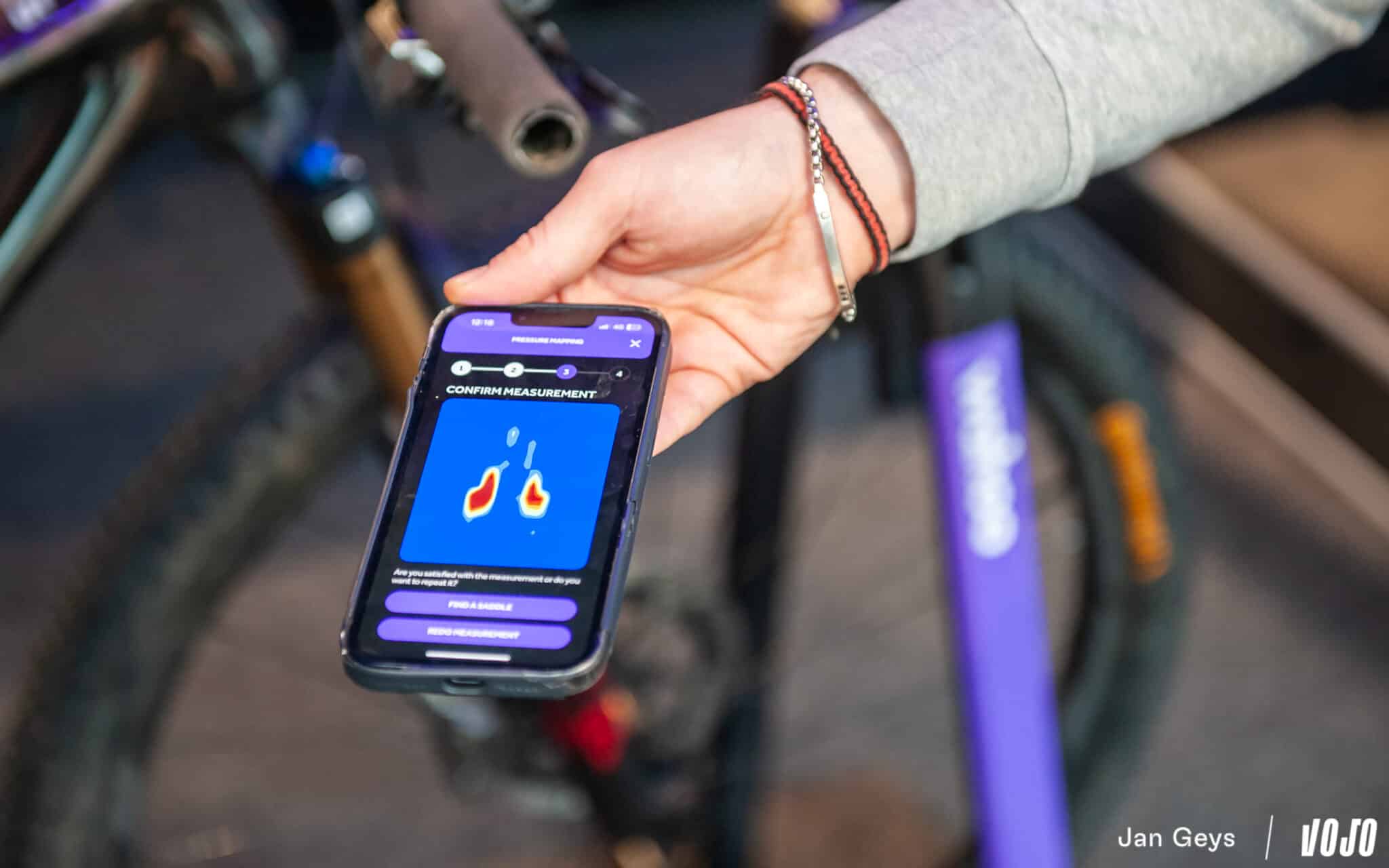 Une fois cette première analyse réalisée, l’application propose une sélection de modèles Fizik (largeur, forme, épaisseur) servant de base à la future selle personnalisée. Après avoir choisi ce modèle de référence, la selle d’origine est démontée et remplacée par celui-ci, puis une seconde mesure est effectuée. L’ensemble du processus — du questionnaire initial à la deuxième analyse — ne prend pas plus d’un quart d’heure.