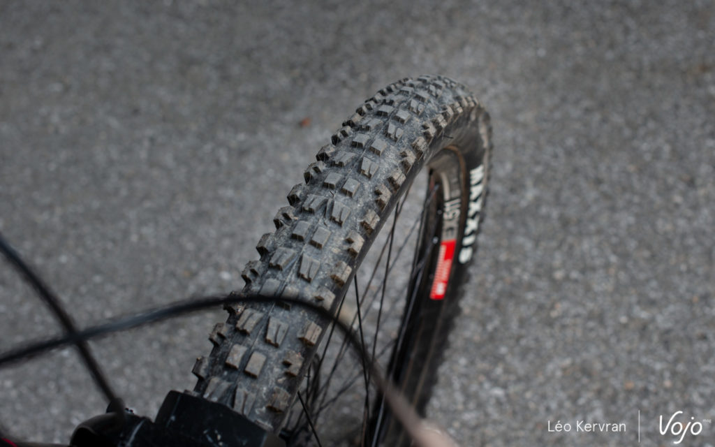 Les pneus sont les biens connus Maxxis DHF 2.5 Exo (avant) et DHR II 2.4 WT Exo+ (arrière), en gomme MaxxGrip pour le premier et MaxxTerra, un peu moins adhérente mais plus résistante à l’usure, sur le second.