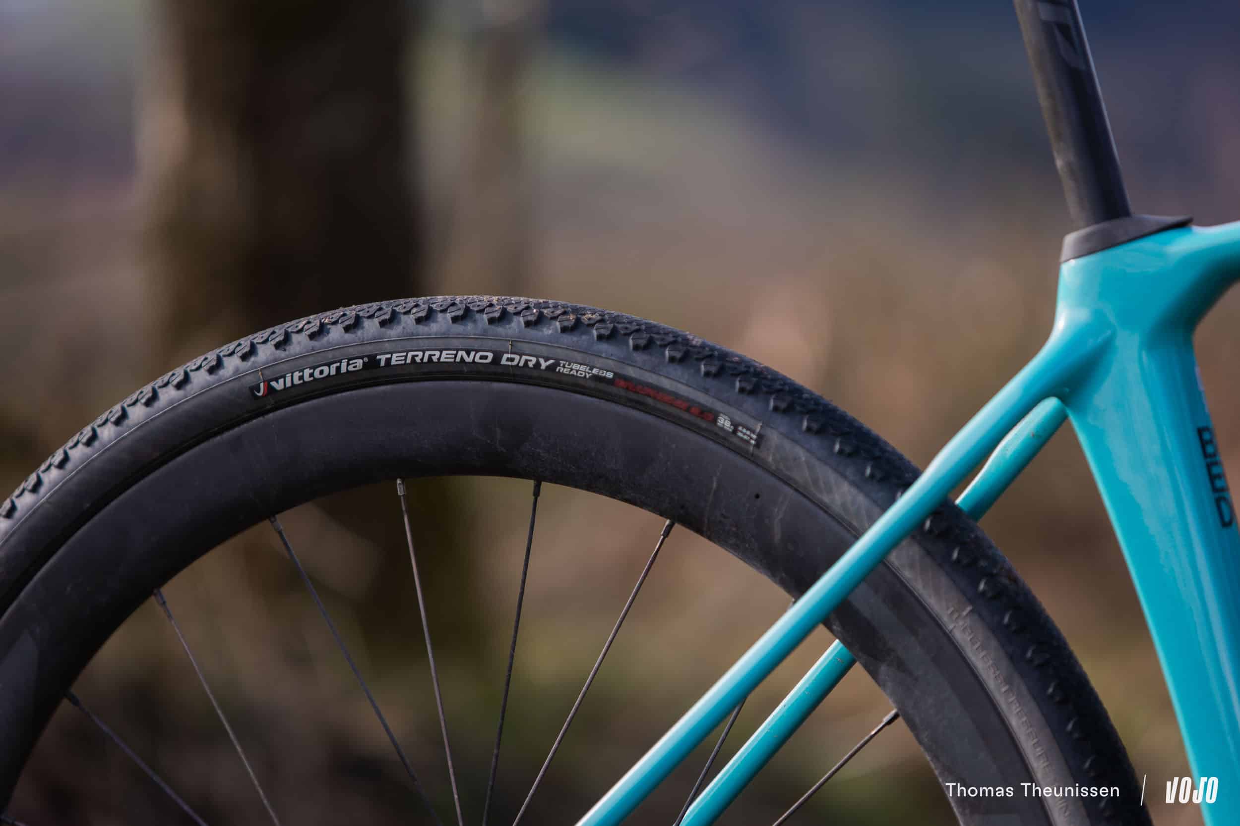 Côté pneus, on trouve d’origine des Vittoria Terreno Dry en 38 mm. Un choix très radical ! Alors, oui, sur route et larges chemins finement empierrés, c’est redoutable niveau rendement et les crampons latéraux très bien pensés offrent un comportement rassurant quand on prend de l’angle, mais adieu la polyvalence quand c’est humide ou plus meuble. Clairement, nous aurions préféré des Vittoria Mezcal en 40 ou 42 mm, toujours assez roulants mais plus polyvalents et apportant un peu plus de confort. Mais bon, c’est quelque chose d’assez facile à changer, ce que nous ne nous sommes pas privés de faire lors de notre essai.