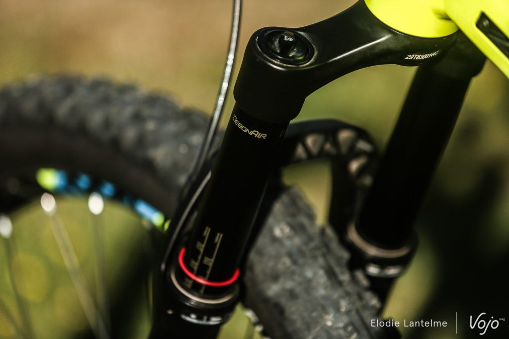 En matière de suspensions, leSDuro LT est doté, à l’arrière, d’un Monarch RC Air et, à l’avant, d’une RockShox Revelation RC en 150 mm. Laquelle, comme la Lyrik ou la Pike, dispose de plongeurs en 35 mm, elle offre donc une bonne rigidité à la torsion.