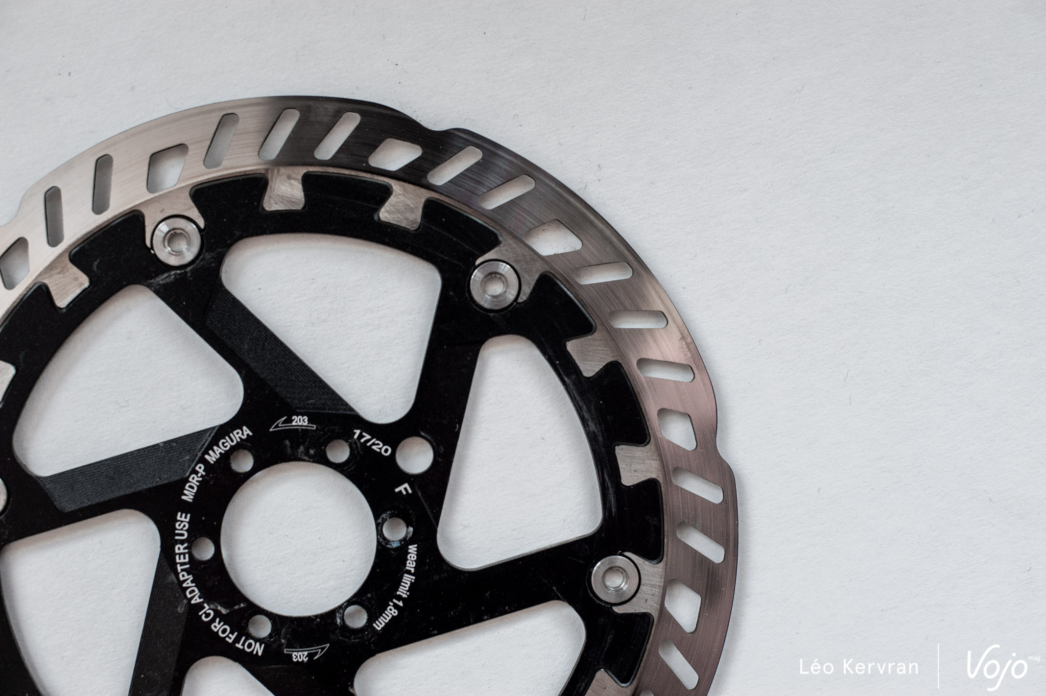 Changer les disques, c’est quelque chose dont on a déjà un peu plus l’habitude. On le voit parfois en XC pour gagner du poids par rapport aux modèles d’origines tandis qu’en enduro ou en descente, c’est sur la puissance et la modulation qu’on cherche à jouer, avec le choix de la taille notamment. En effet, un grand disque a un bras de levier plus grand qu’un petit disque (la piste de freinage est plus loin de l’axe de la roue) donc l’avantage mécanique est plus important : à effort égal sur la piste de frein, la force exercée au niveau de l’axe est plus importante. La marque annonce ainsi 10 % de « puissance » supplémentaire pour un 203 mm par rapport à un 180 mm.