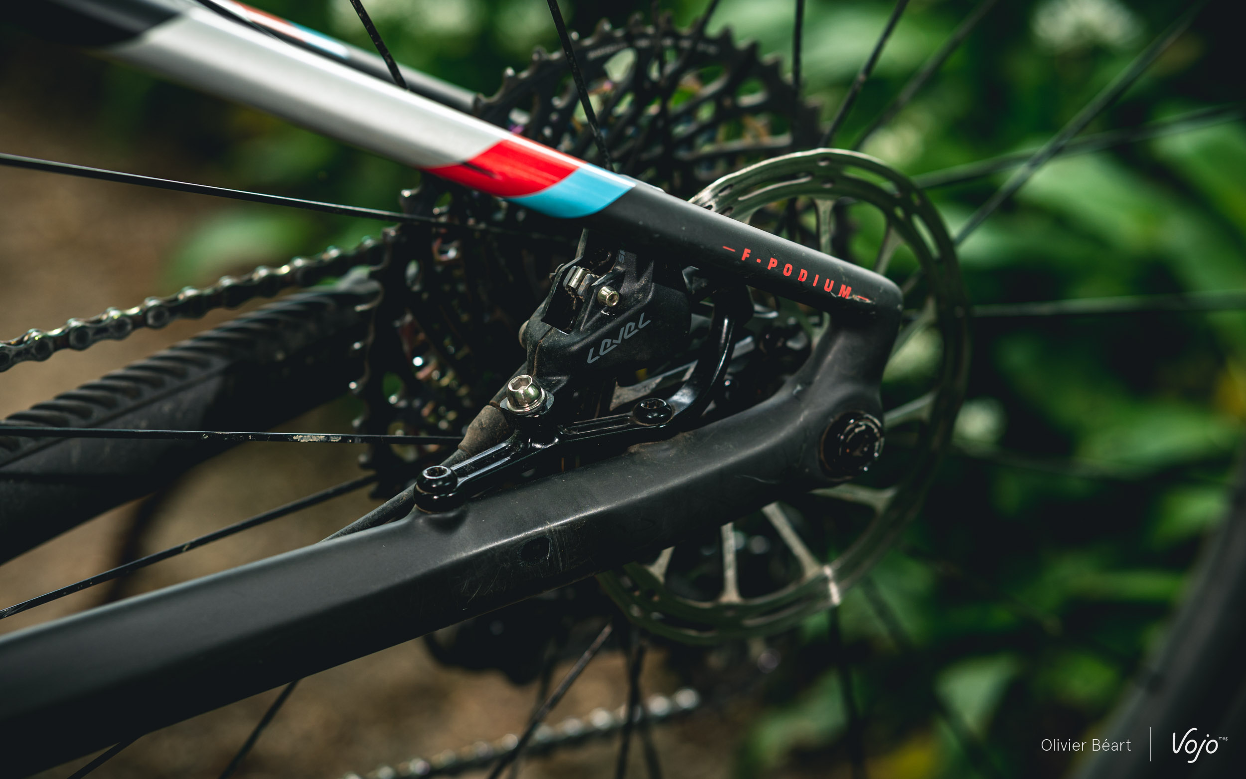A l’arrière, le F-Podium reprend la Zero Suspension qu’on retrouve sur tous les vélos de la marque. Sur ce système à point de pivot virtuel, l’amortisseur est monté flottant entre les deux biellettes. L’objectif de cette architecture est de réduire le pompage. Zero signifie d’ailleurs zéro pompage, zéro kick back et zéro verrouillage au freinage. Voilà qui méritera d’être vérifié sur le terrain.