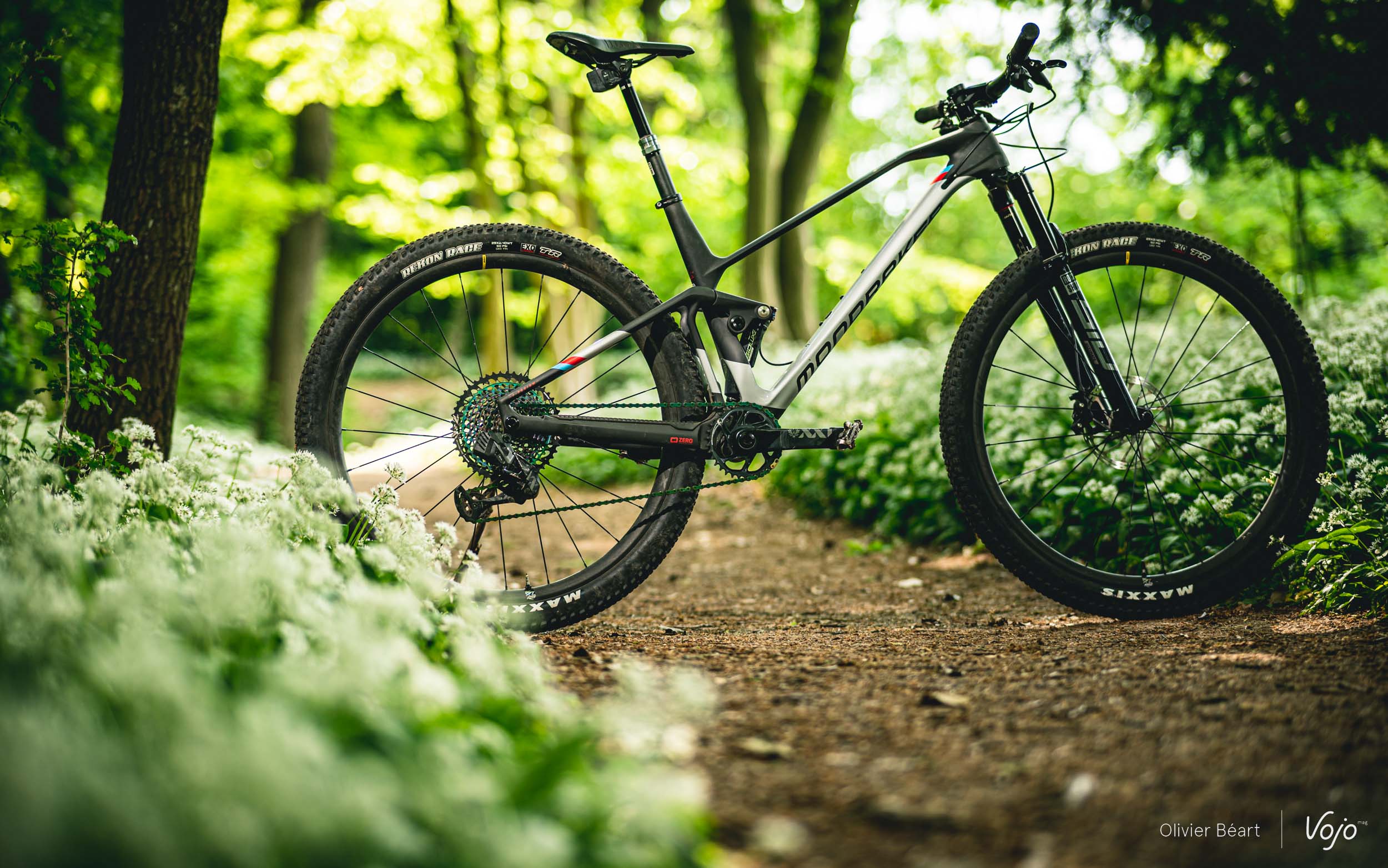 Au niveau des pneus, on retrouve le Maxxis Rekon Race en section 2.4 à l’avant comme à l’arrière. Nous avons déjà eu l’occasion de le dire : si nous comprenons ce choix pour des athlètes XC qui roulent sur des circuits poncés par les nombreux passages et où les racines/cailloux sont à nu, ces pneus XC larges et peu cramponnés nous semblent moins pertinents pour rouler dans des conditions mixtes. Même pas besoin qu’il fasse boueux : dans la gravette ou avec une simple couche de feuilles ou d’humus, la grande largeur combinée au manque de crampons donne l’impression de flotter sur le sol plutôt que de le mordre pour trouver le grip. Ce constat est encore plus vrai avec les pneus Maxxis, et nous avons tendance à suggérer de revenir à du 2.25 ou 2.3 avec un peu plus de crampons pour plus de polyvalence.