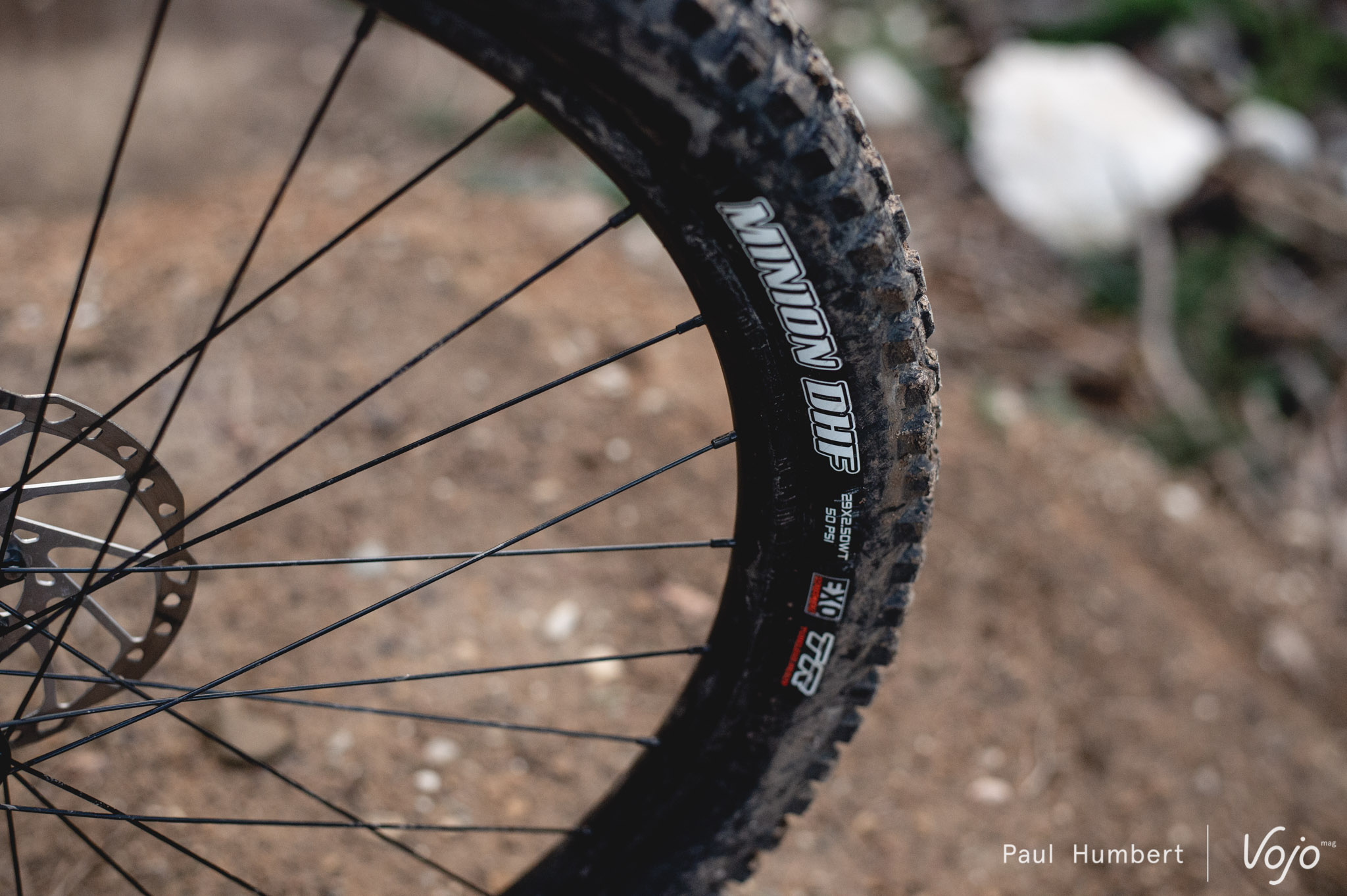 On ne vous cache pas que pour ce prix, on aurait aimé voir un peu mieux, au moins sur un poste en particulier (suspension, freins, transmission ou roues). Ici, rien ne se détache et certains éléments paraissent un peu hors programme, comme les pneus Maxxis en carcasse Exo, très souple et légère et pas vraiment à sa place sur un vélo avec une telle géométrie et autant de débattement. Comme vous pouvez le voir sur les photos, nous avons d’ailleurs essayé d’autres pneus sur le vélo (Hutchinson Griffus et Specialized Butcher notamment), pour mieux cerner le comportement de la plateforme, sans être limité par les gommes.