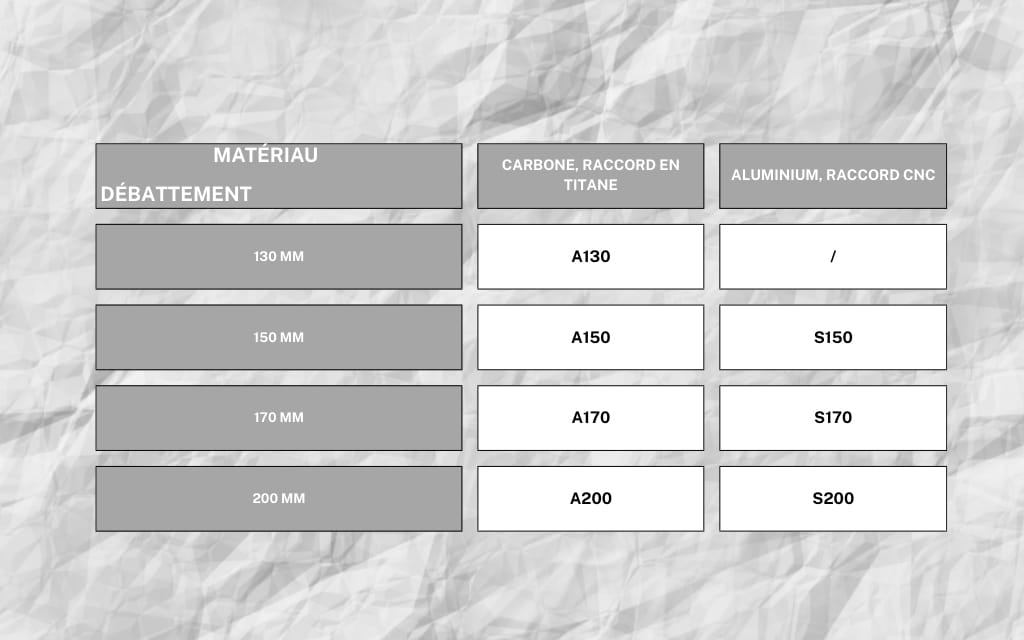 Voilà qui permet de dresser un tableau récapitulatif de la gamme offerte par Atherton Bikes : d’un côté, les modèles estampillés « A » pour ceux bénéficiant de tubes en carbone et raccord en titane imprimés en 3D, et les modèles « S » pour ceux en aluminium et raccords en aluminium usinés CNC ; tandis que le chiffre qui suit désigne le débattement à la roue arrière… donc pour le S150 : modèle avec tube en aluminium et 150 mm de débattement arrière. Facile !