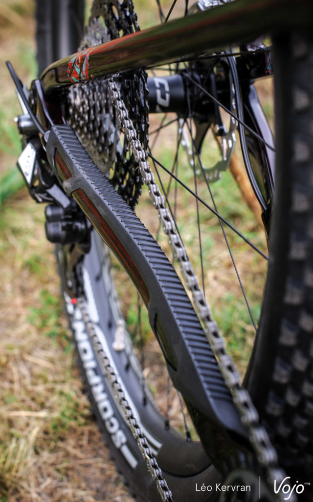 C’est la seule nouveauté majeure puisque le cadre conserve son jeu de direction Acros BlockLock avec butées et entrées de gaines intégrées, ainsi que le dégagement pour des pneus de 2,4″ de section. Comme souvent sur les vélos de XC, les gaines ne sont pas guidées dans le cadre mais simplement protégées par des fourreaux en mousse. Enfin, la sortie de la Durit de frein arrière sur la base a été légèrement décalée afin d’améliorer son trajet.