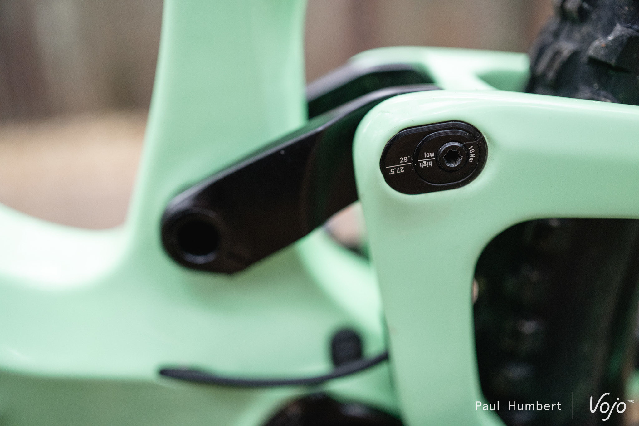 Puisqu’on parle d’elle, la géométrie est… enduro. A l’instar du débattement, elle correspond relativement bien à l’idée qu’on se fait d’un enduro moderne et à ce qu’on trouve ailleurs, du côté « long » du spectre tout de même avec son reach à 460 mm en taille M ou 490 mm en taille L. Les coupelles réversibles du jeu de direction permettent de choisir entre une position polyvalente (64,5°) et une autre plus radicale (63,2°) tandis que le flip-chip placé entre les haubans et la biellette permet de faire varier la hauteur du boîtier de pédalier de 8 mm. On retient aussi des bases de 437 mm dans toutes les tailles tandis que les plus grands apprécieront le reach de 520 mm en XL ainsi que l’angle de selle droit (77,8°).