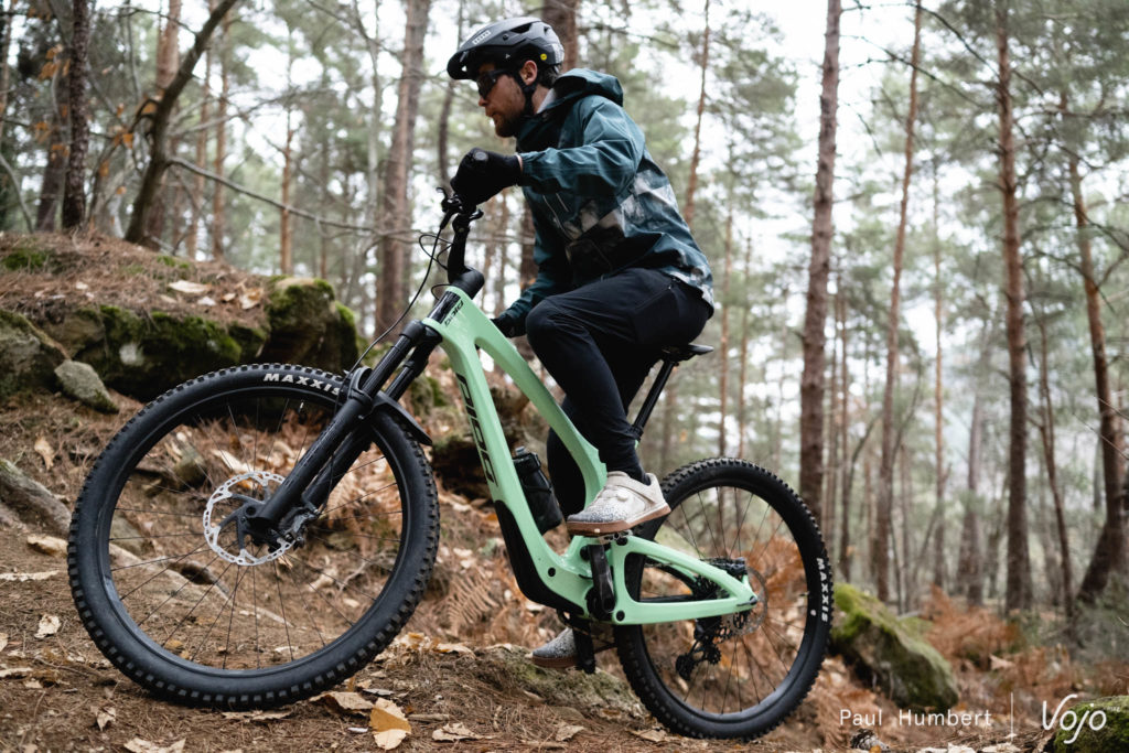 Pour finir, notez qu’avec cet angle de direction de 63,2° combiné à un stack dans la moyenne haute du segment, l’Unplugged est plus à l’aise lorsqu’il y a un minimum de pente. Lorsque le terrain est trop plat il peut être difficile de charger suffisamment la roue avant et le vélo tend alors au sous-virage… mais qui choisit un vélo en 160/170 mm pour rouler sur du faux plat ? Retourner les coupelles du jeu de direction pour passer à 64,5° d’angle permet probablement de corriger un peu cela mais nous n’avons pas encore pu essayer cette configuration.