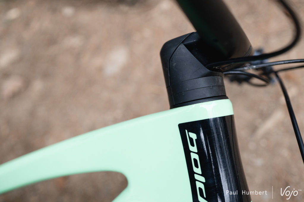 Au passage, si vous souhaitez baisser la potence on vous souhaite bon courage : comme avec tout Scott ou Bold récent, l’Unplugged utilise des entretoises spécifiques sous la potence qui ne peuvent pas aller au-dessus. Dans l’esprit de ses concepteurs, le système est simple : si on descend la potence, on coupe le pivot. Alors oui, rien ne dépasse et certains trouveront ça joli mais quand on veut faire des essais pour trouver la bonne hauteur il faut se procurer des entretoises classiques pour aller au-dessus de la potence, retirer un cache en plastique et idéalement changer le capot de potence. Pratique.