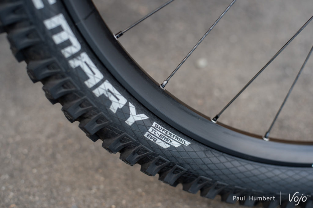 Côté pneus, nos Schwalbe étaient dotés d’une nouvelle carcasse appelée SuperTrail et qui peut être comparée à l’Exo+ de Maxxis. Elle a plutôt bien fonctionné et on apprécie cet ajout dans la gamme du fabricant allemand, qui manquait clairement d’une vraie carcasse solide et polyvalente mais pas trop lourde entre la SnakeSkin et la SuperGravity. A l’arrière, on profitait d’un Nobby Nic aux crampons redessinés et en gomme Addix Soft (autre nouveauté sur ce modèle), un pneu parfois décrié mais qu’on a apprécié ici pour sa résistance au roulement correcte ainsi que son comportement prévisible et cohérent vis-à-vis du vélo, facile à placer en glisse pour tourner dans les nombreuses épingles du Beaufortain mais stable au freinage.