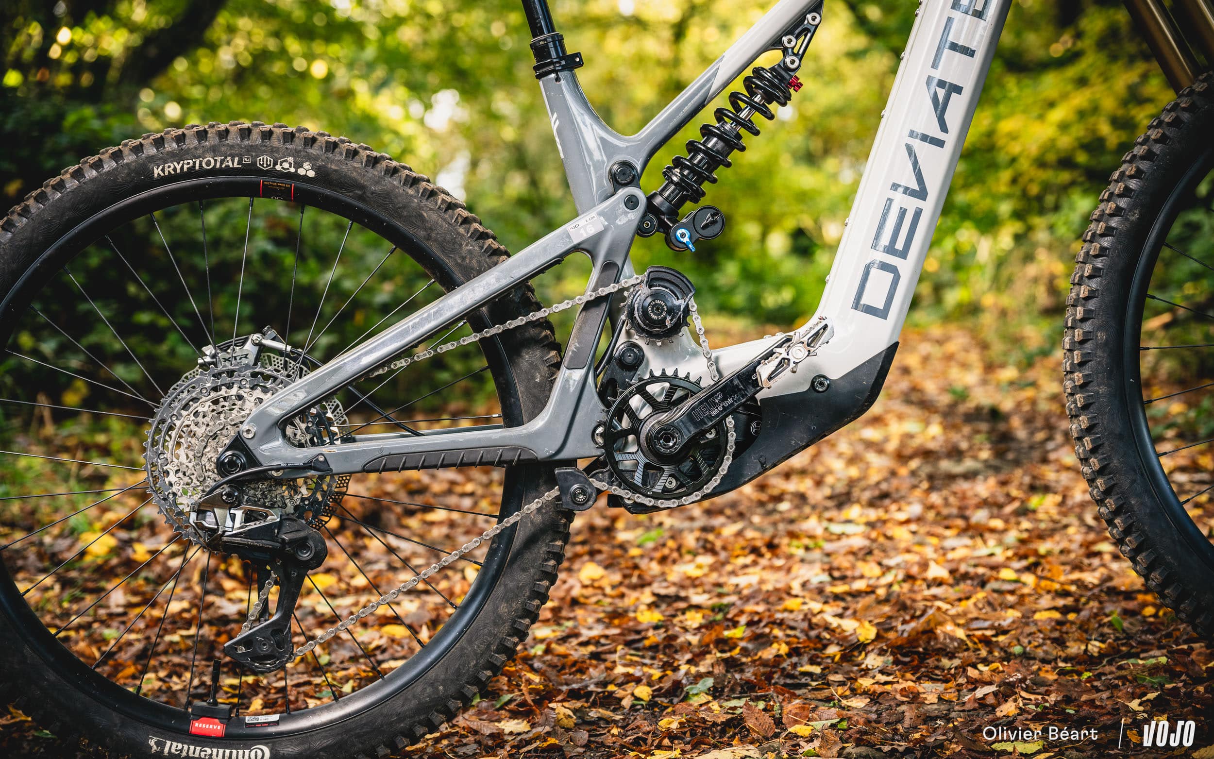 Les deux têtes pensantes de Deviate croient dur comme fer aux vertus des suspensions high pivot et Chris a développé une cinématique spécifique qui équipe désormais toute leur gamme. Les avantages : pas de pedal kickback, donc une suspension très active tout le temps ; d’excellentes performances au freinage (suspension qui reste active et qui ne modifie pas la géométrie) ; et un trajet de la roue arrière qui allonge les bases au plus la suspension rentre dans le débattement, de sorte qu’on garde la maniabilité des bases courtes dans les courbes lentes et serrées tout en ayant la stabilité d’un vélo plus long dans le défoncé.