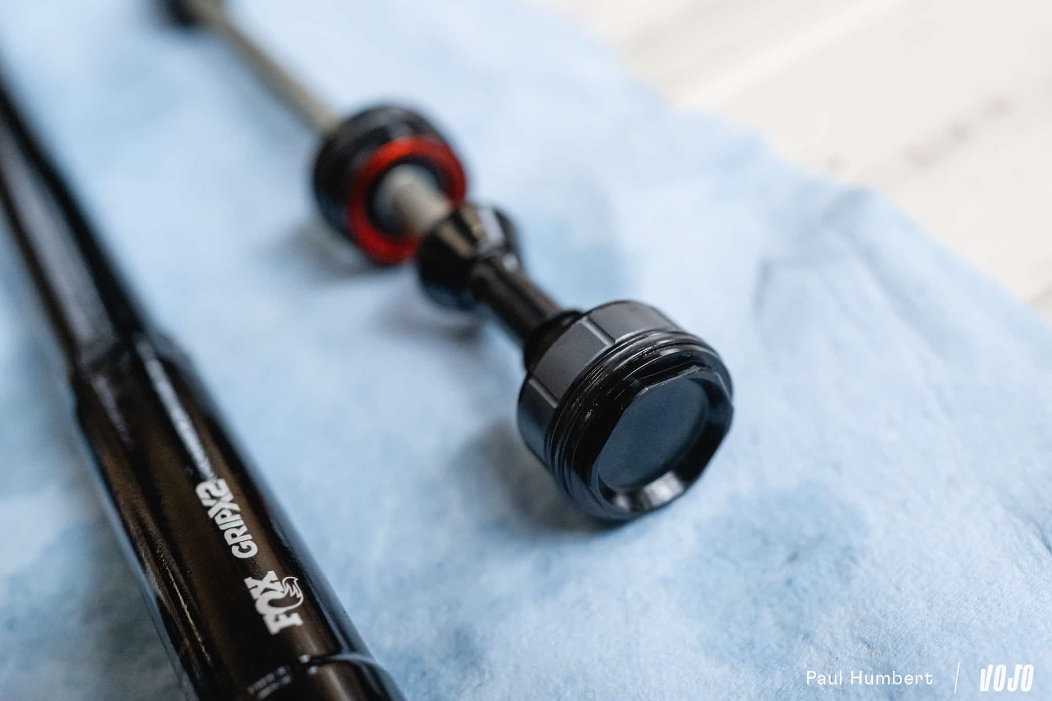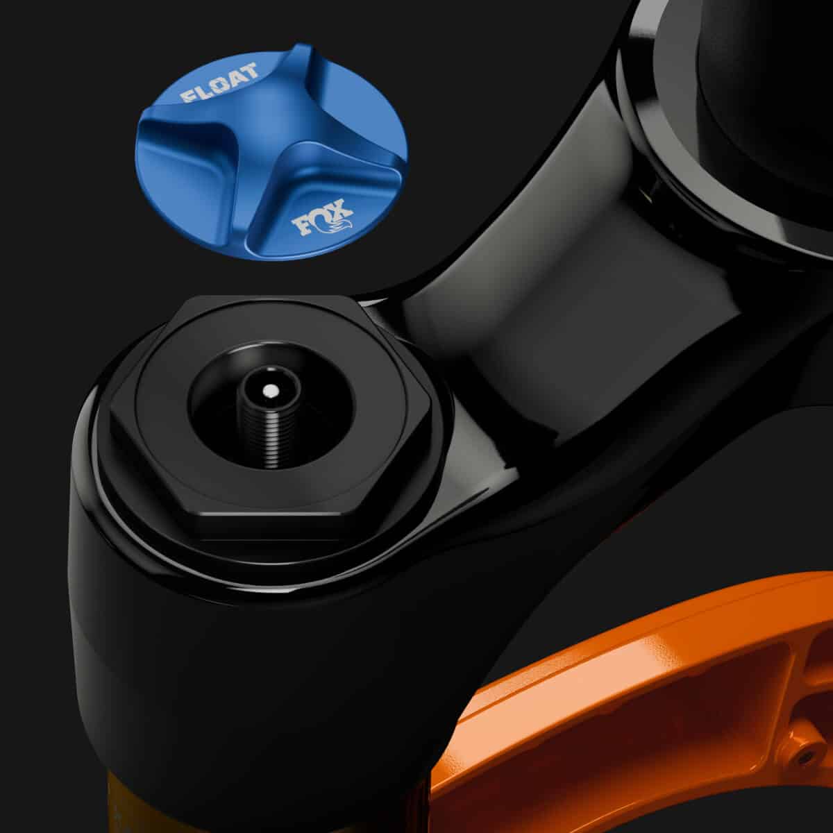 Fox abandonne sa construction à double chambre pour un nouveau design nécessitant plus de volume d’air. On repère ce changement au léger déport vers le haut de la valve de gonflage, qui offre un gain de volume pour l’air.