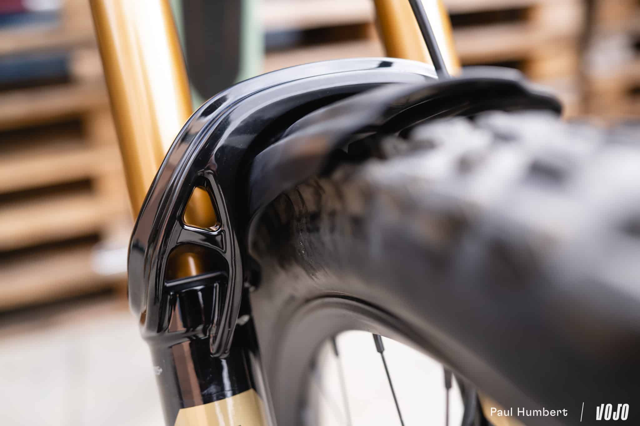 On repère la nouveauté avec cet arceau ajouré. Il est le témoin du travail fait par la marque américaine sur la rigidité du châssis. Pourquoi plus de rigidité pour une fourche qui ne semblait pas en manquer ? La marque répond qu’en contrôlant mieux son châssis, on optimise la qualité de l’amortissement. Ce n’est donc pas vraiment plus de rigidité dans l’absolu que la marque a cherché à procurer, mais une rigidité mieux dosée.