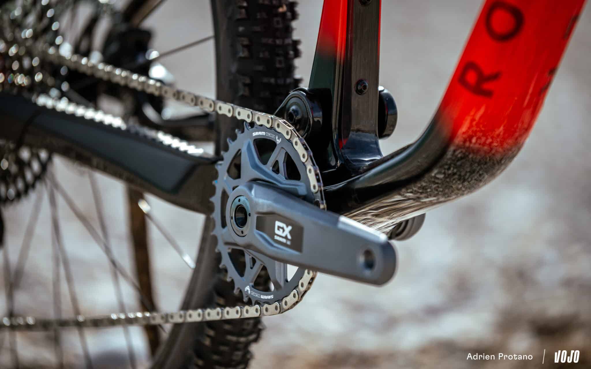 On se contentera ici de rappeler que le cadre est entièrement construit en carbone et affiche 1,655 kg sans amortisseur en taille M, et 1,9 kg une fois équipé de la suspension arrière. Au-delà d’une question de poids en tant que tel, c’est surtout le ratio poids/rigidité que la marque explique avoir optimisé pour obtenir un châssis offrant la meilleure réactivité possible.