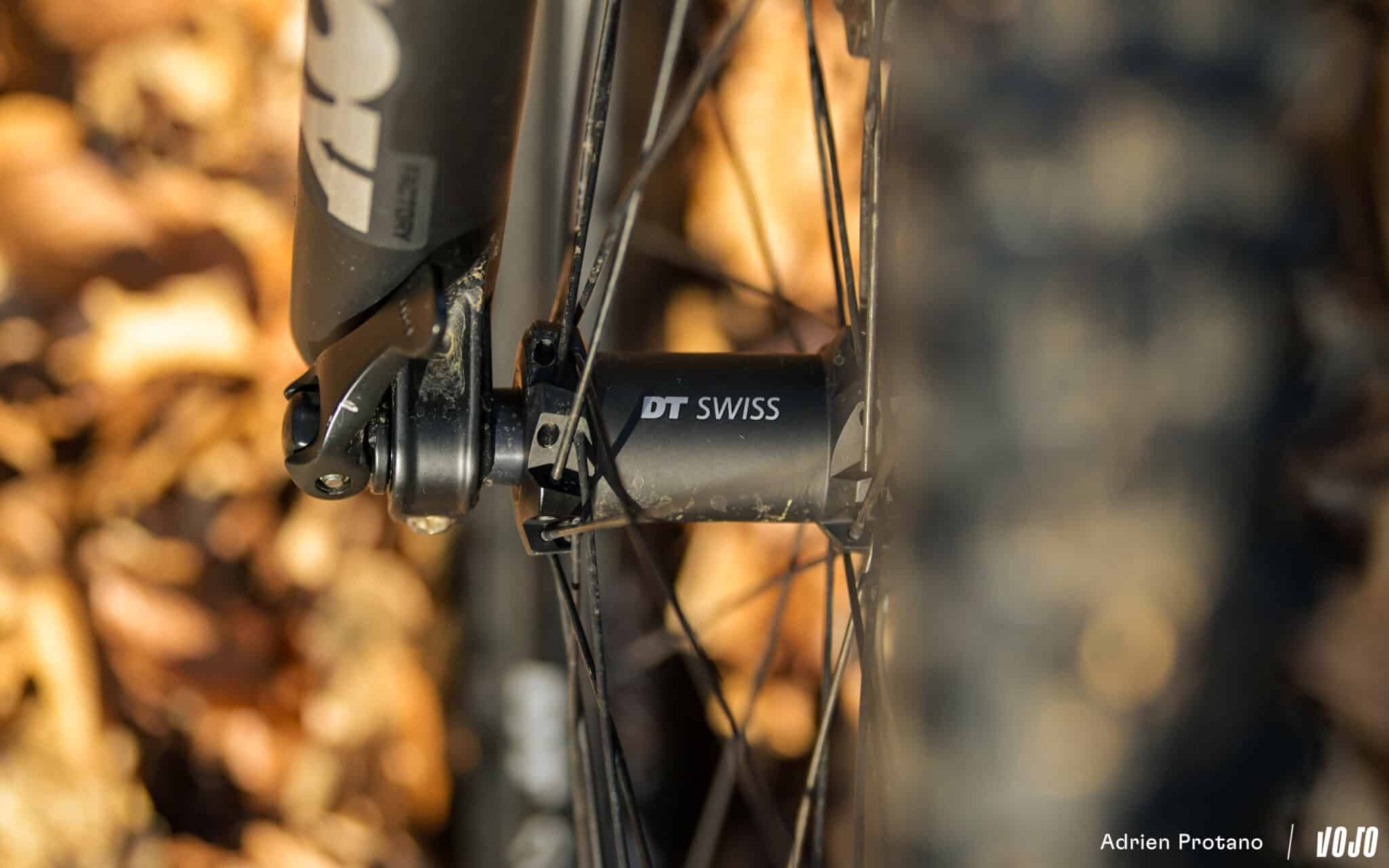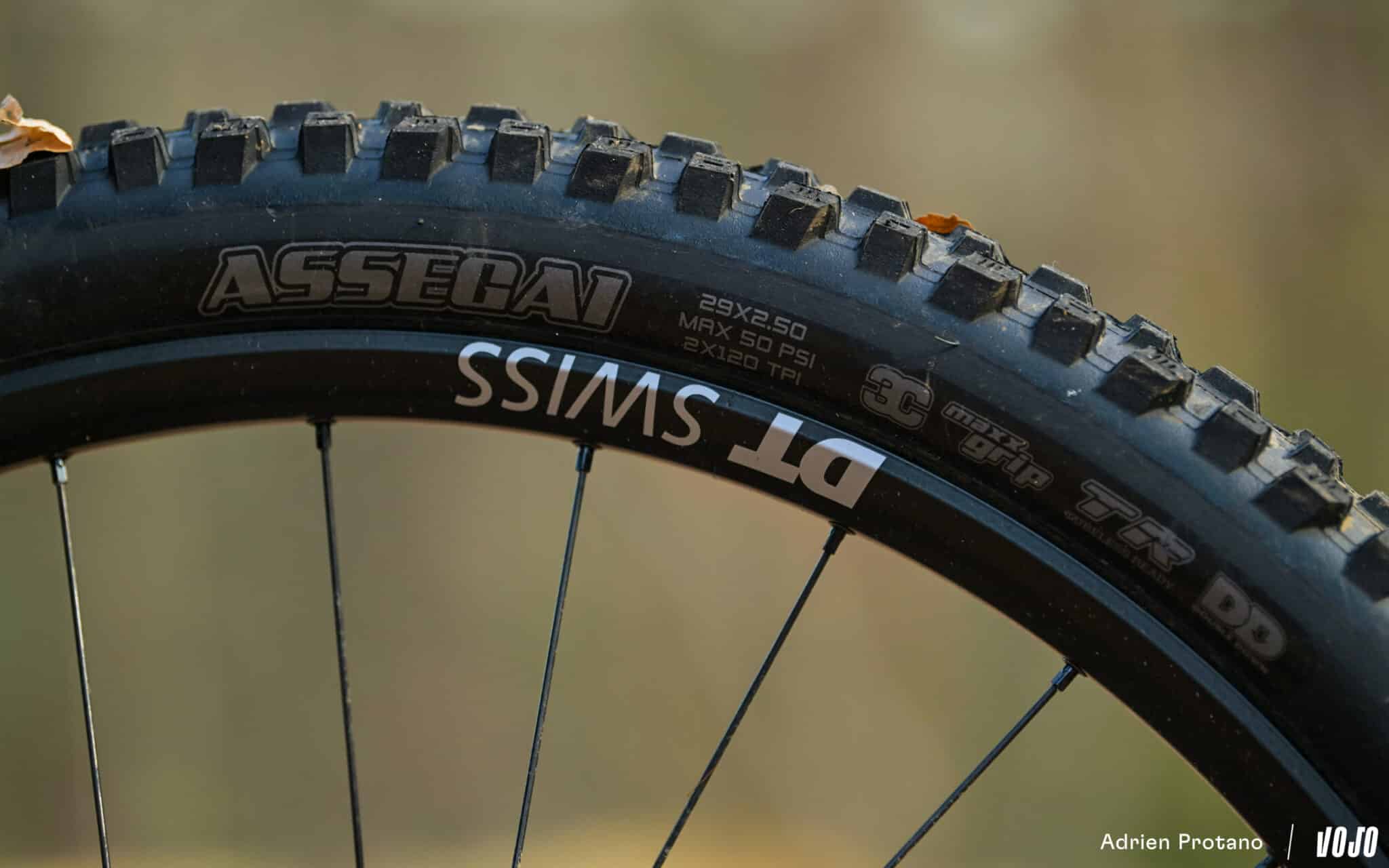 Si la marque a récemment revu sa gamme 1700… c’est ici les H1900 Hybrid de chez DT Swiss que l’on retrouve, chaussées de pneumatiques Maxxis Assegai à l’avant et Minion DHR à l’arrière. C’est un des points que Megamo a revus pour cette nouvelle génération : le passage à des pneus en carcasse renforcée DoubleDown, malgré le surpoids de ceux-ci. Un choix qu’on salue !