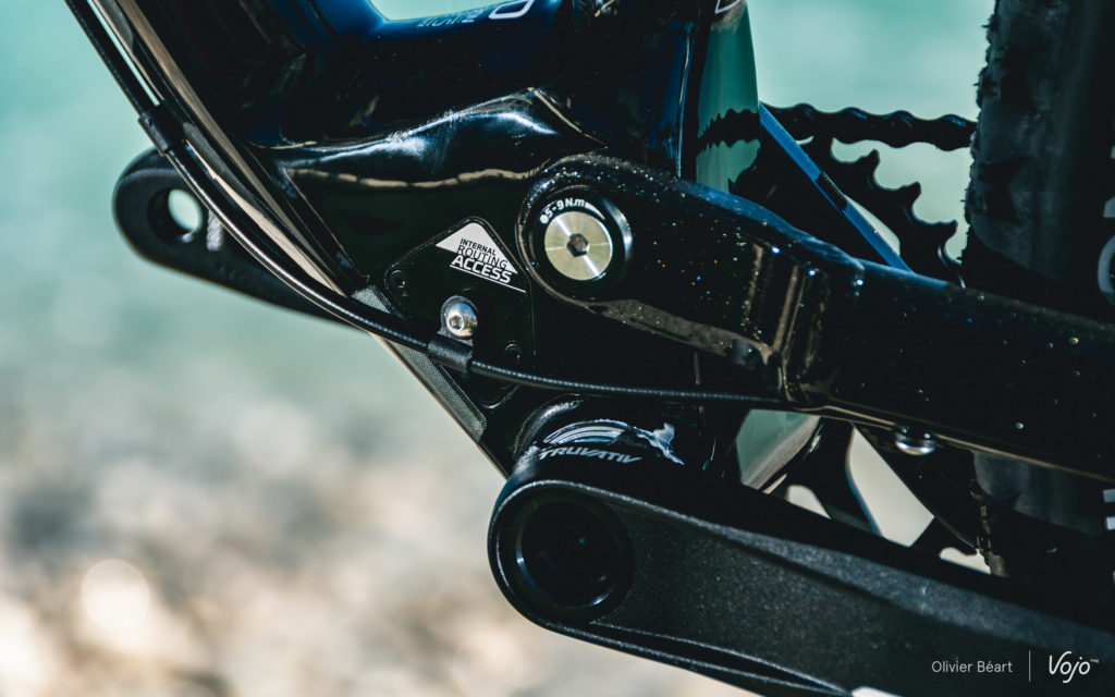 Soigné et racé, le triangle avant en carbone intègre un passage interne de câble uniquement pour le dérailleur arrière. Une trappe au niveau du boîtier de pédalier permet de passer facilement cette zone souvent difficile et de diriger le câble vers le bras arrière sans difficulté. La Durit de frein arrière reste en externe avec un passage discret sous le tube diagonal, ce qui est une bonne idée pour l’accessibilité. Idem pour le câble du lockout de l’amortisseur, qui est cependant moins discret.