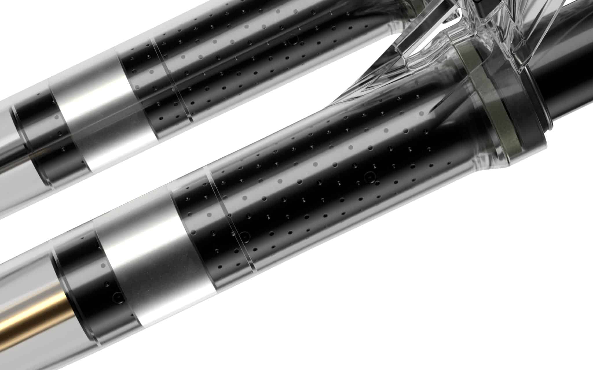 Sur cette nouvelle génération, cela passe notamment par l’introduction du ButterWagonTech (réservé aux versions Ultimate). Concrètement, RockShox a usiné une série de micro-cavités directement dans les plongeurs, sous les joints racleurs. Ces micro-réservoirs vont stocker un peu d’huile et la redistribuer en continu vers les bagues au fil du débattement. L’objectif est simple : maintenir un film d’huile constant entre plongeur et bague, là où, habituellement, la lubrification peut devenir irrégulière au fil des heures de roulage.
