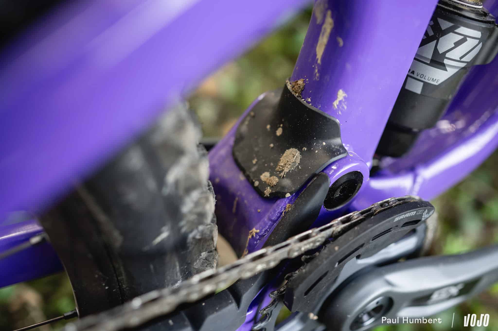 Côté caoutchouc et protections, on retrouve un protège-base et un petit « flap » derrière le point de pivot principal contre les projections et les cailloux qui se coincent.