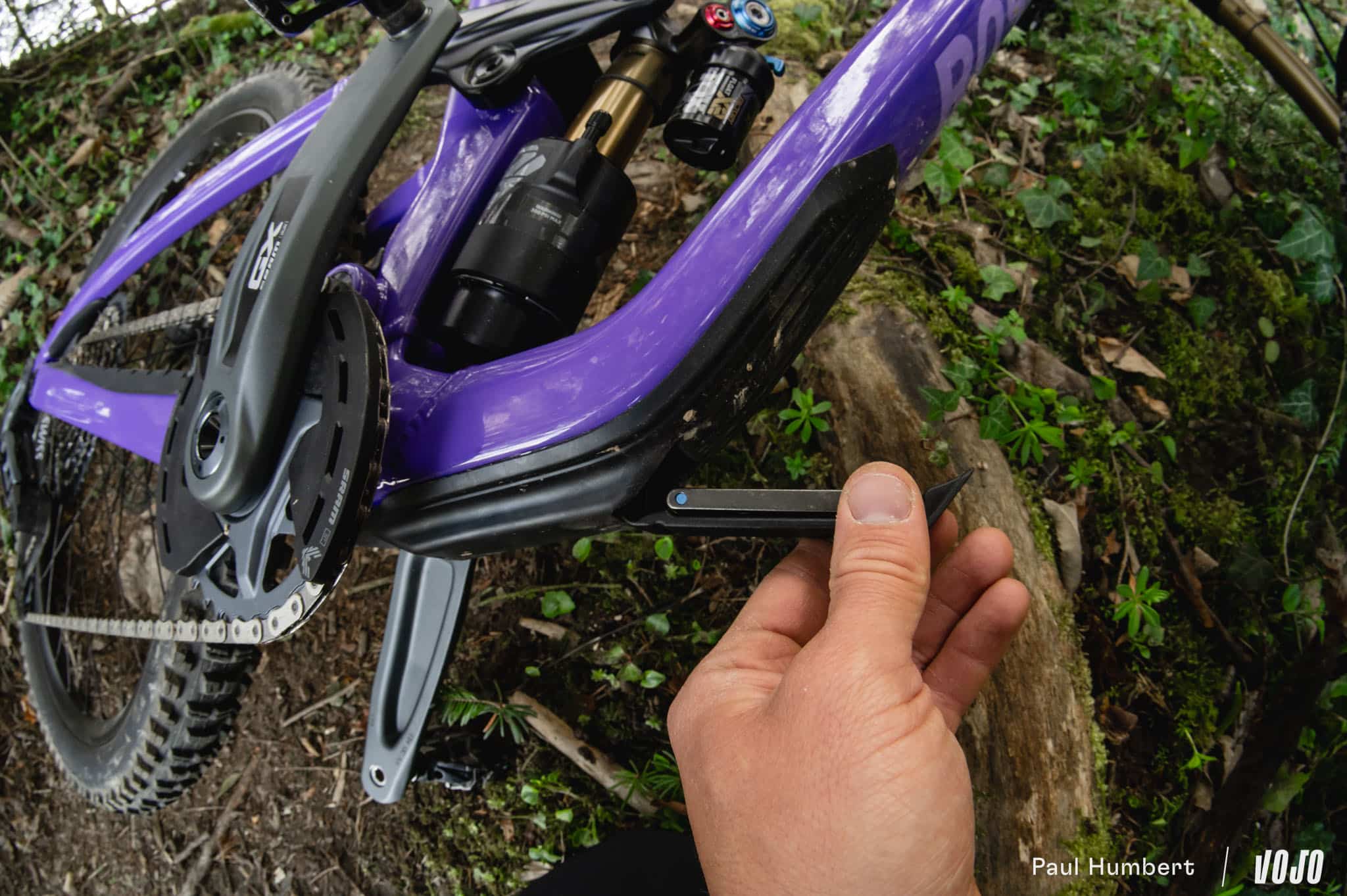 Un multi-outils vient s’intégrer dans la protection en caoutchouc sous le boitier de pédalier. C’est malin, mais on doit avouer que le système pourra se raffiner, la sortie et la remise en place n’étant pas aussi fluides qu’on aurait aimé. C’est également un espace qui se charge en terre pendant les sorties boueuses.