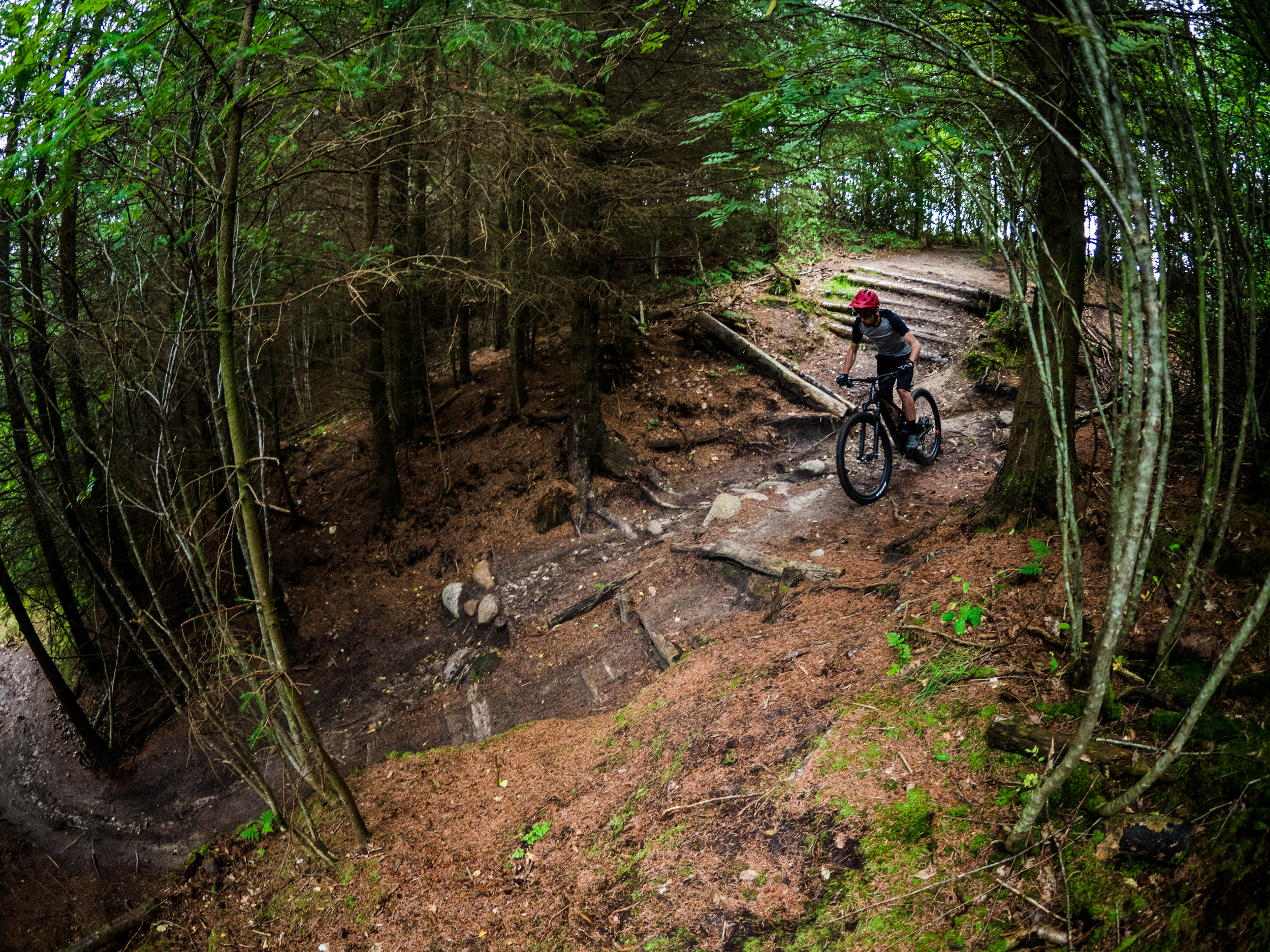 La suspension est assez linéaire et finalement assez difficile à régler pour ce type de terrain, où l’on alterne petits chocs répétés sur les racines et gros impacts sur les sauts. En jouant avec la pression des pneus, on arrive à trouver un compromis satisfaisant pour cette prise en main mais dans le cadre d’une utilisation régulière, ajouter quelques spacers dans l’amortisseur est une idée à considérer.
